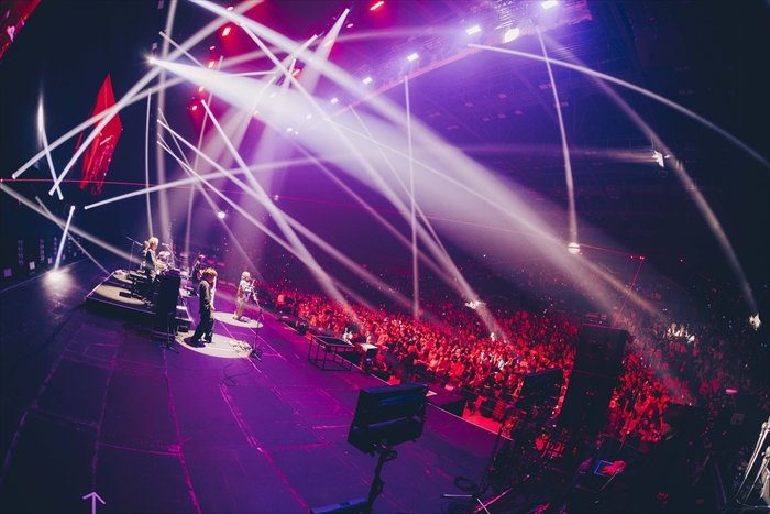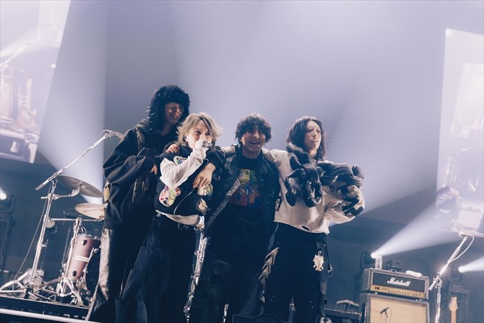 そんな決意と共に、この日初披露したのが新曲「暴露」。四つ打ちの強靭なリズムにラウドなギターとsyudouの鋭利なラップが交錯する攻撃的なナンバーだ。その後も勢いは止まらない。自らギターを掻き鳴らして始まった「あいきるゆぅ」では、レーザーが飛び交う中、バンド全体が塊となって放つパワーが、観客を圧倒する。