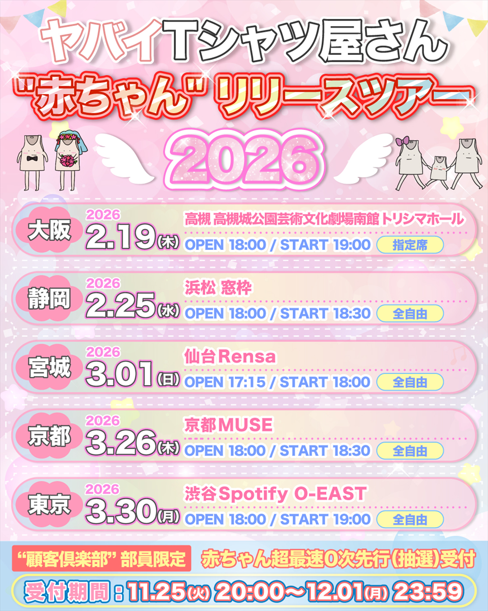 さらに、「ヤバイTシャツ屋さん “赤ちゃん” リリースツアー 2026」の開催も決定している。通常、CDをリリースすると行われる”リリースツアー”であるが、今回はありぼぼの出産を記念して開催される。ツアーはありぼぼの地元・大阪・高槻からスタートし、その後もりもりもとの地元・静岡・浜松や、こやまたくやの地元・京都、さらに仙台と東京の全5箇所を回る。こちらのチケットは現在、ヤバイTシャツ屋さんオフィシャル会員サイト"顧客倶楽部”にて、”顧客倶楽部" 部員限定 赤ちゃん超最速0次先行(抽選)受付中なので、是非チェックして欲しい[12/1(月) 23:59まで]。