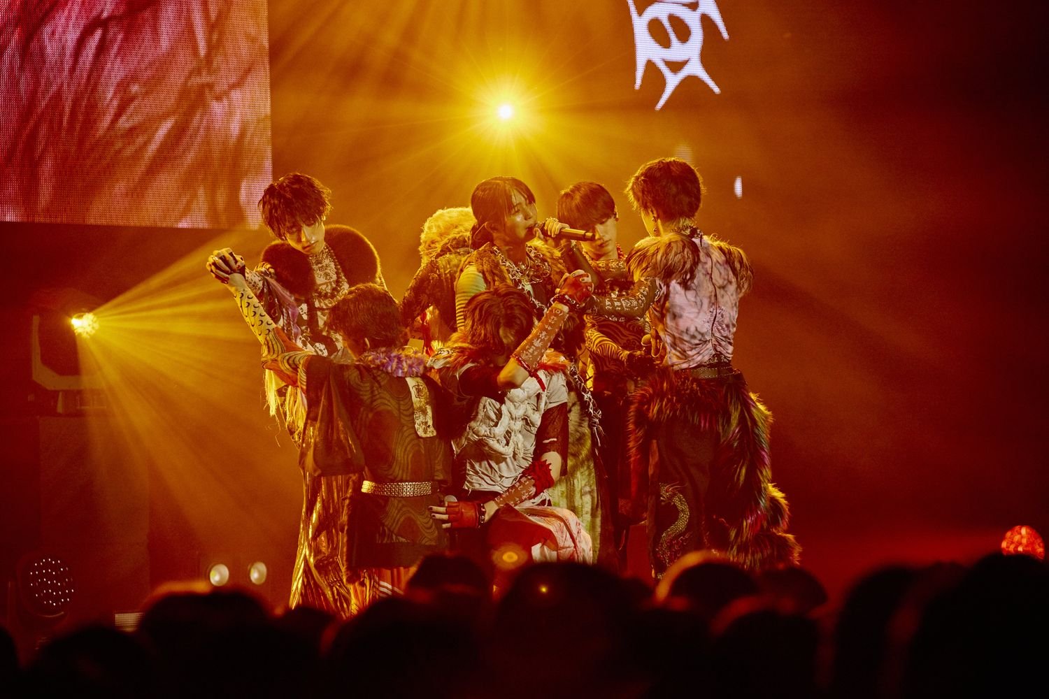 その後に披露されたのは最新アルバムのリード曲「Dark Heroes」。漆黒に染まった衣装も相まって、まさしく”ダークヒーロー”の世界観をメンバーは存分に表現していた。しかし「Dark Heroes」の雰囲気からは一転、続いて披露された強いエネルギーを感じさせるナンバー「Tap tap tap!」では、会場からも思わずハンズクラップが巻き起こった。
