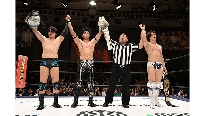 チームリーダーの上野は「こうやって、チームで進んでいく力を見せられるのは大変光栄。今日の試合を武知海青が乗り越えたということは、痛みと恐怖と…。この数戦ですべての値のマックスを体験しています。海青は最強の男に近づいておりまして、鈴木さんと戦い、いつか僕と戦うことがあれば、このベルト(無差別級)に近づくことでしょう。まずは6人タッグのベルト、3人で無限防衛」と永久保持も視野に入れた。15日後に迫った鈴木戦については「僕は世界の鈴木みのるにUNIVERSALを獲られて、これが世界だ。世界がUNIVERSALを持てば、こんなに広がって面白くなるのかと思いました。僕はDDTプロレスの王様です。それで、世界の鈴木みのるに勝つことで、僕がDDTにいながら世界に届けられる。そんな、世界に響くチャンピオンになってみせます。僕が鈴木みのるに勝ちたいのは鈴木みのるがすごいから。鈴木みのるのようになりたいから。でも、僕は僕だから、鈴木みのるに勝って、UNIVERSALも無差別も6人タッグのチャンピオンでもあって、このDDTを、プロレス界を盛り上げちゃうぞ」と3冠王宣言。