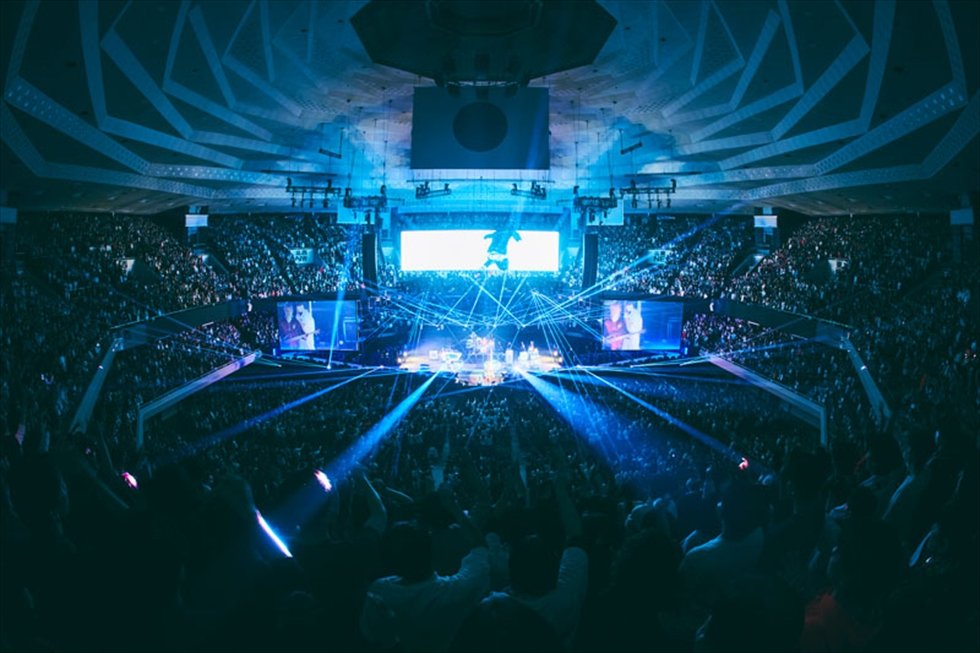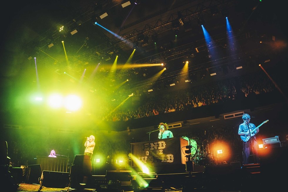 舞台を囲んで360度、全座席が開放され、アリーナはもちろん、2階スタンドの最後列までびっしりと埋め尽くされた客席の期待が募りに募るなか、先攻として登場したのはSEKAI NO OWARIだ。四つ打ちのビートを基軸にしたダンサブルなアッパーチューン「Death Disco」をオープナーに「RPG」「Habit」と代表曲を次々に披露して、会場をたちまち熱狂の坩堝と化してゆく。なお、この日のMCでFukaseが語ったところによればSEKAI NO OWARIが日本武道館でライブを行うのはなんと14年ぶり。「UVERworldのみなさんに呼んでいただいたおかげで武道館に帰ってくることができました」とバンドを代表して感謝を告げるFukaseに大きな拍手が注ぐ。