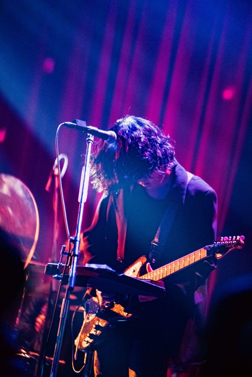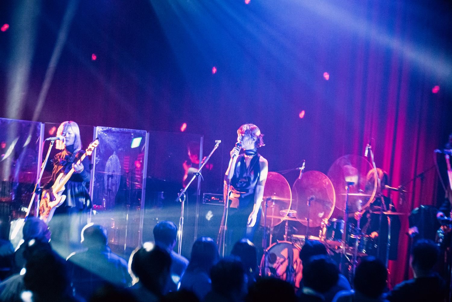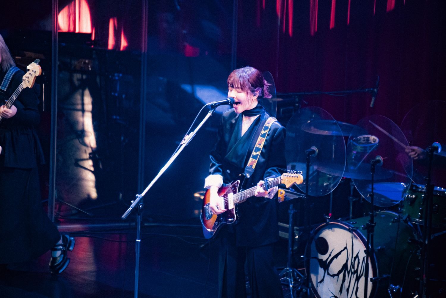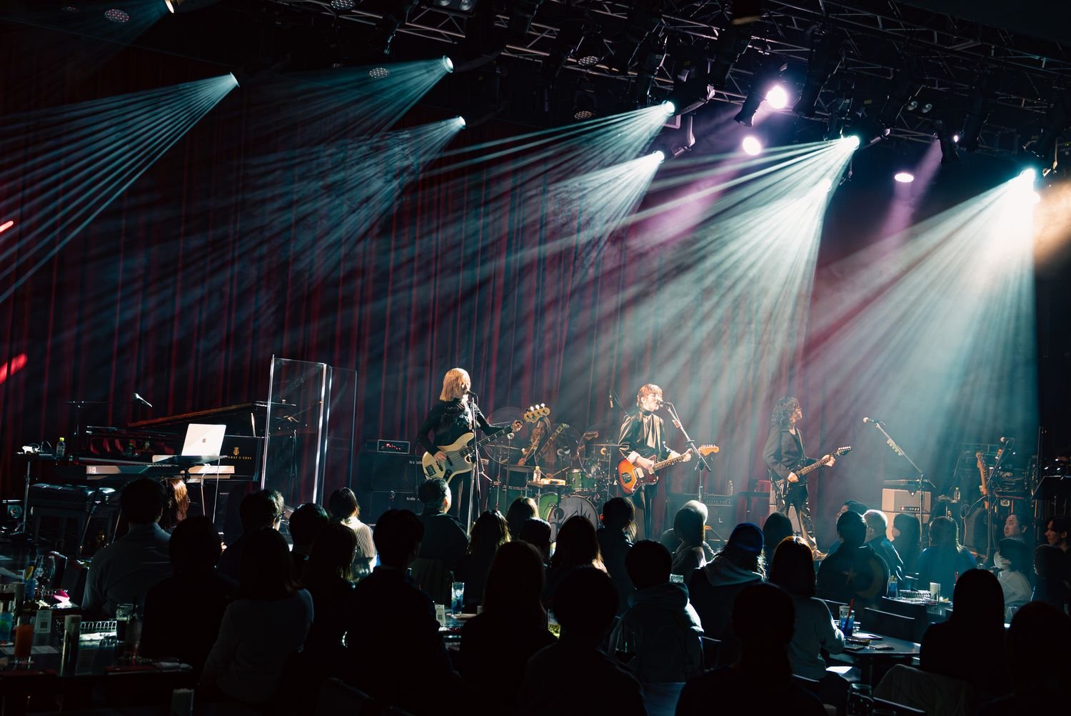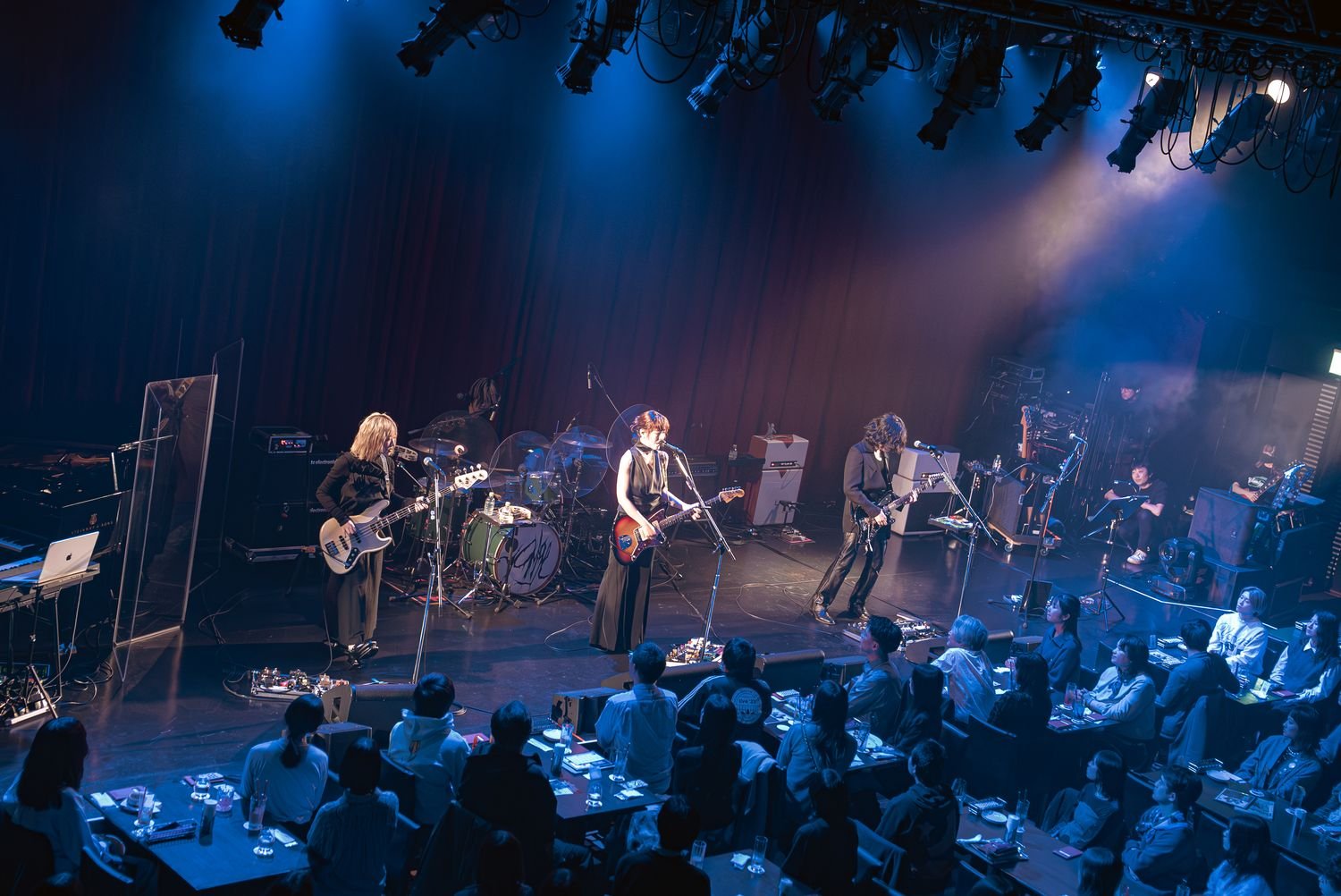 「ゴーン」なんてオノマトペを授けたくなるほどに深くベースが潜り込んだ「Exorcist」、ミラーボールが揺らめく最中、牛丸のローな歌唱がベッドルームミュージック的な空間を生成した「Club Night」を終え、中間ブロックを締め括ったのは「沙希」。深い青の光が舞台へと注ぎ、ピアノがしずしずと鳴らされると、ストリングスにも似た響きを宿したギターが重なっていく。ワインレッドのカーテンに投影される斑ら模様は、〈ヘッドライトの光天井を泳いでった〉の1節と重なり合い、吐息を感じるくらいの親密な空気へフロアを染め上げていった。