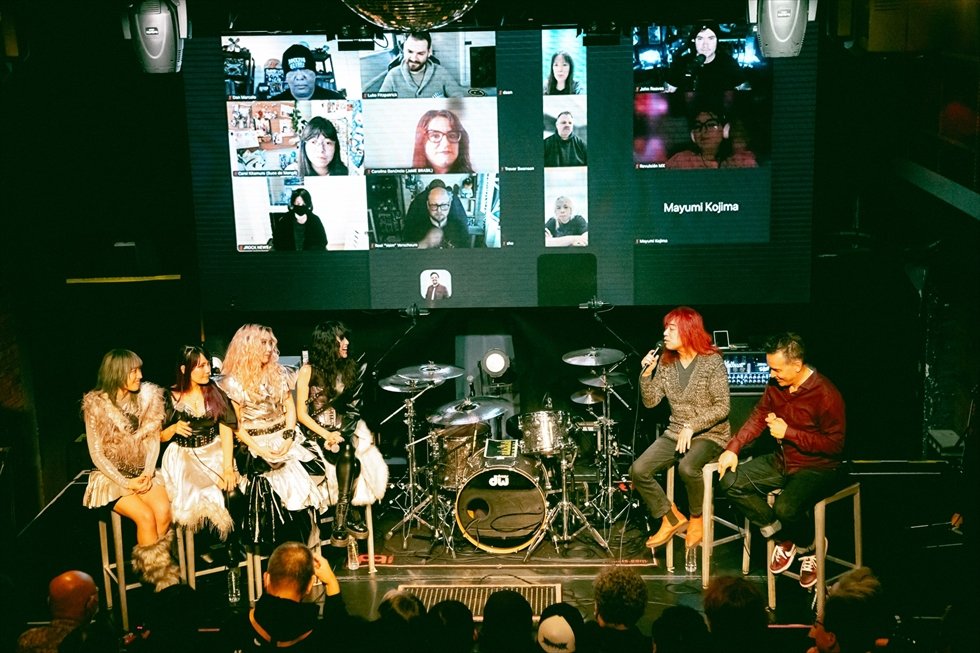 ステージ後ろのビジョンにはリモート参加の海外メディアの記者陣が映し出される。