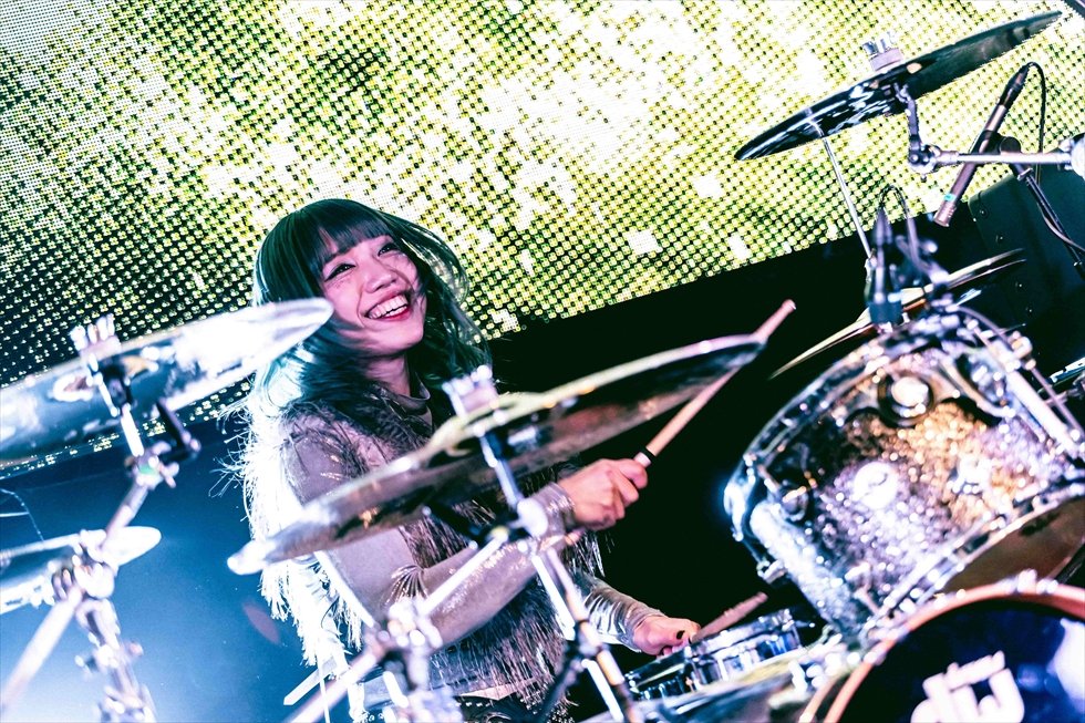 伸びやかなAnnaの声がどこまでも突き抜けていく。どっしり構えるMihoのグルーヴも、艶やかなシルエットから繰り出す鮮やかなプレイのTokiも、キャリアに裏打ちされたスキルと貫禄を感じるステージングを魅せていくが、多くの目と耳を奪ったのはKanoのドラムだ。