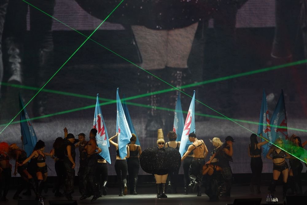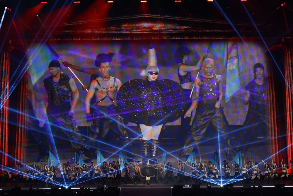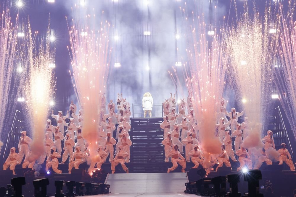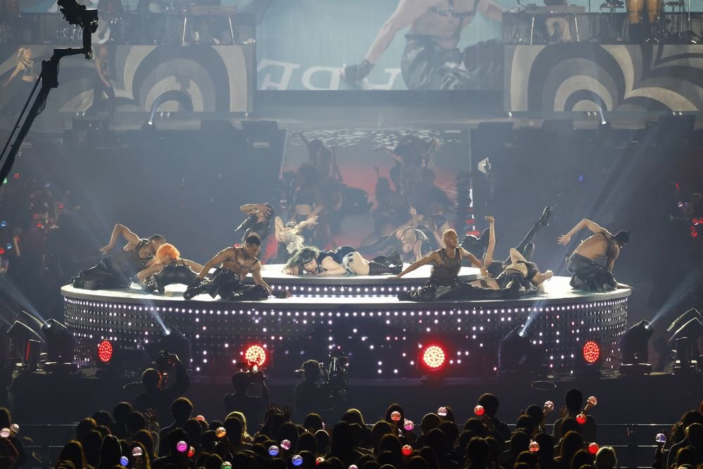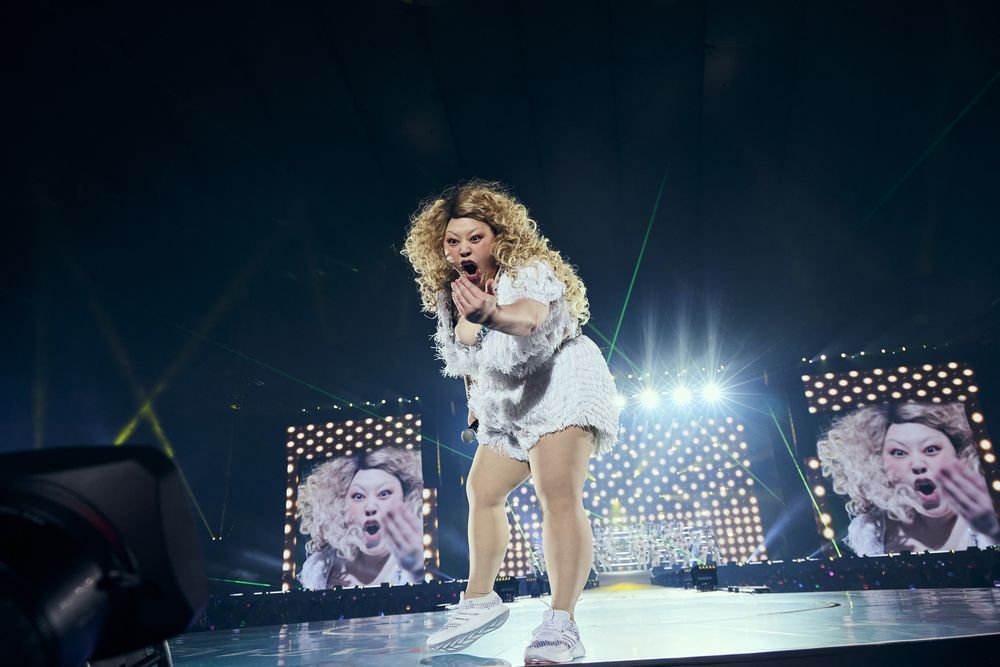 いよいよショーもフィナーレ。ダンサーがメインステージに集まると、その中心から現れたのは「徹子の部屋」出演時のレディー・ガガを彷彿とさせる衣装に身を包んだ渡辺の姿。そしてレディー・ガガの「Judas」が始まると、ダンサーが踊る中で渡辺は微動だにせず、その対比で笑わせる。かと思いきや、その衣装を脱ぎ捨てると、ダイナミックなダンスで魅了。さらにレディガガよろしくダンサーに抱えられながら花道を進んでまた笑いを誘うも、その直後には円形のステージで艶やかな表情やスキルフルなダンスで観客の視線を釘付けに。世界をうならせるエンターテイナーぶりをこれでもかと見せていった。