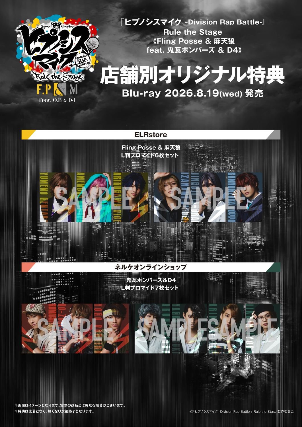 加えて、店舗別購入特典の絵柄と内容も公開された。ELR Storeの特典では、Fling Posse & 麻天狼 L判ブロマイド6枚セットを、ネルケオンラインショップの特典では、鬼瓦ボンバーズ&D4 L判ブロマイド7枚セットを手に入れることができる。