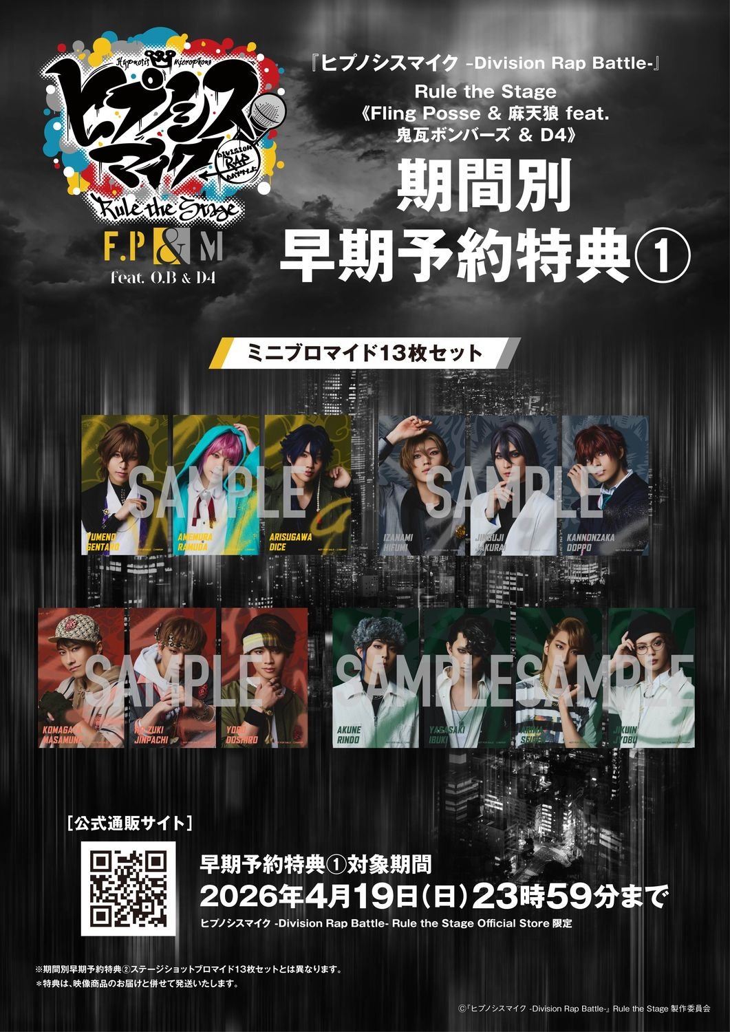 あわせて、HYPNOSISMIC Rule the Stage Official Storeでの公演期間中限定の第一弾早期予約特典として、ミニブロマイド13枚セットが、第二弾早期予約特典として、ステージショットブロマイド13枚セットが特典となることも決定。
