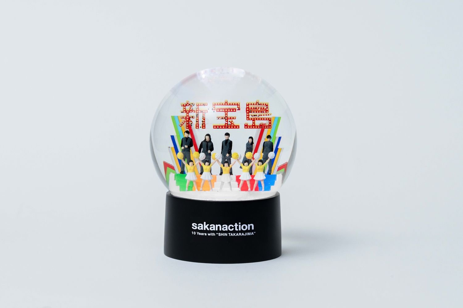 sakanaction 10 Years with “SHIN TAKARAJIMA” の販売が発表された。新商品として「新宝島」MVの印象的な場面を再現したスノードームや、MV内で存在感を放ったネオン看板をモチーフにしたキーホルダーに加え、前回販売時に好評を博した「新宝島 TEE 2024 ver.」の再販を実施する。