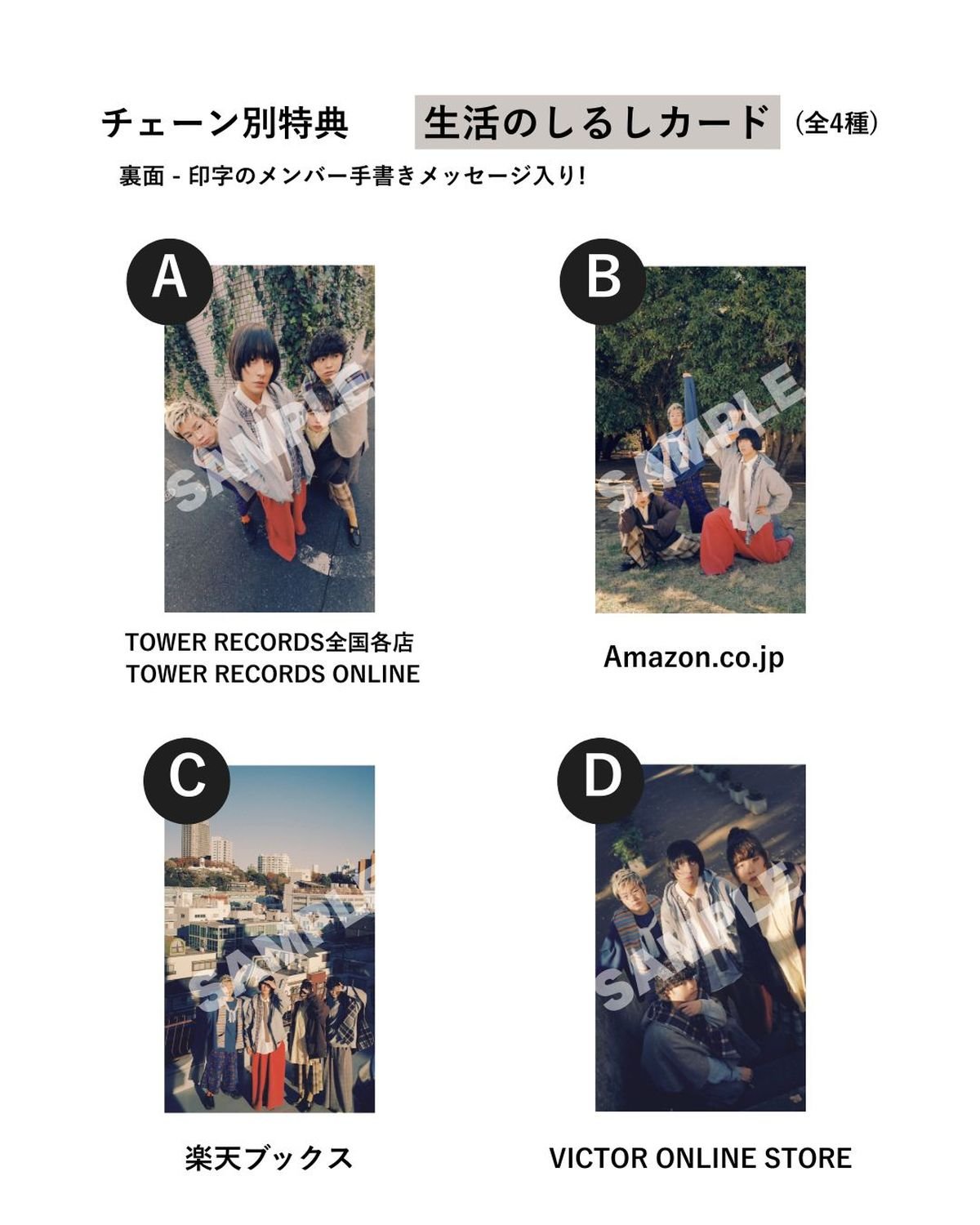 また、対象チェーン別特典「生活のしるしカード」(全4種)の絵柄も解禁となった。表面はメンバー撮り下ろし写真、裏面は印字のメンバー手書きメッセージが入ったカードとなる。1月18日(日)までに対象チェーン店にて予約すると、未作品化となるアコースティックバージョンの音源が収録された早期予約特典「未作品化音源CD『つまみ食い』」もプレゼントされるので、ぜひ期間内に予約をお忘れなく。