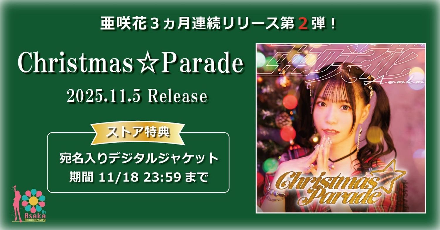 2025年10月に10周年を迎えた亜咲花が、デジタルシングル3か月連続リリース第2弾となる楽曲『Christmas☆Parade』を11月5日(水)にリリースいたしました。