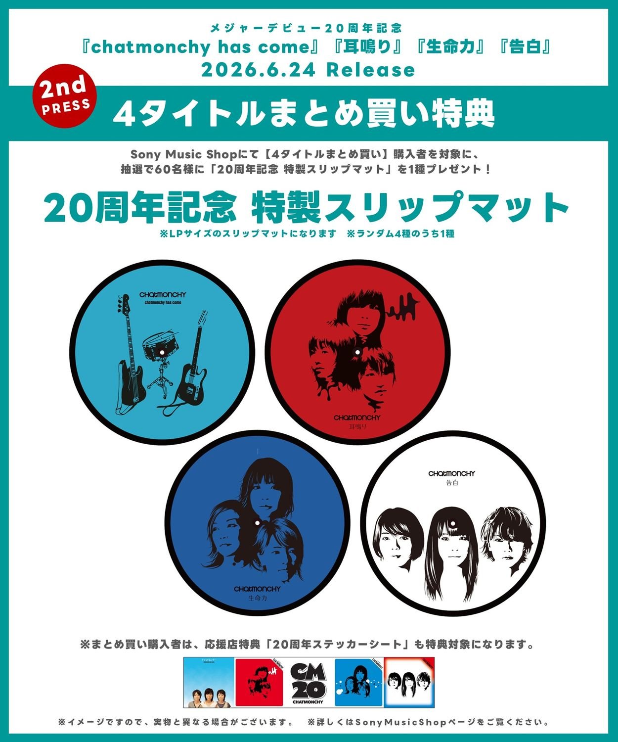 また、Sony Music Shop限定で、4タイトルまとめ買い購入者の中から抽選で60名様に「特製スリップマット(全4種のうちランダム1種)」を特典としてプレゼントすることも発表。各タイトルの印象的なアートワークをあしらったスペシャルなLPサイズのスリップマットになっており、今回のクリアヴァイナル仕様がより一層映える特典だ。