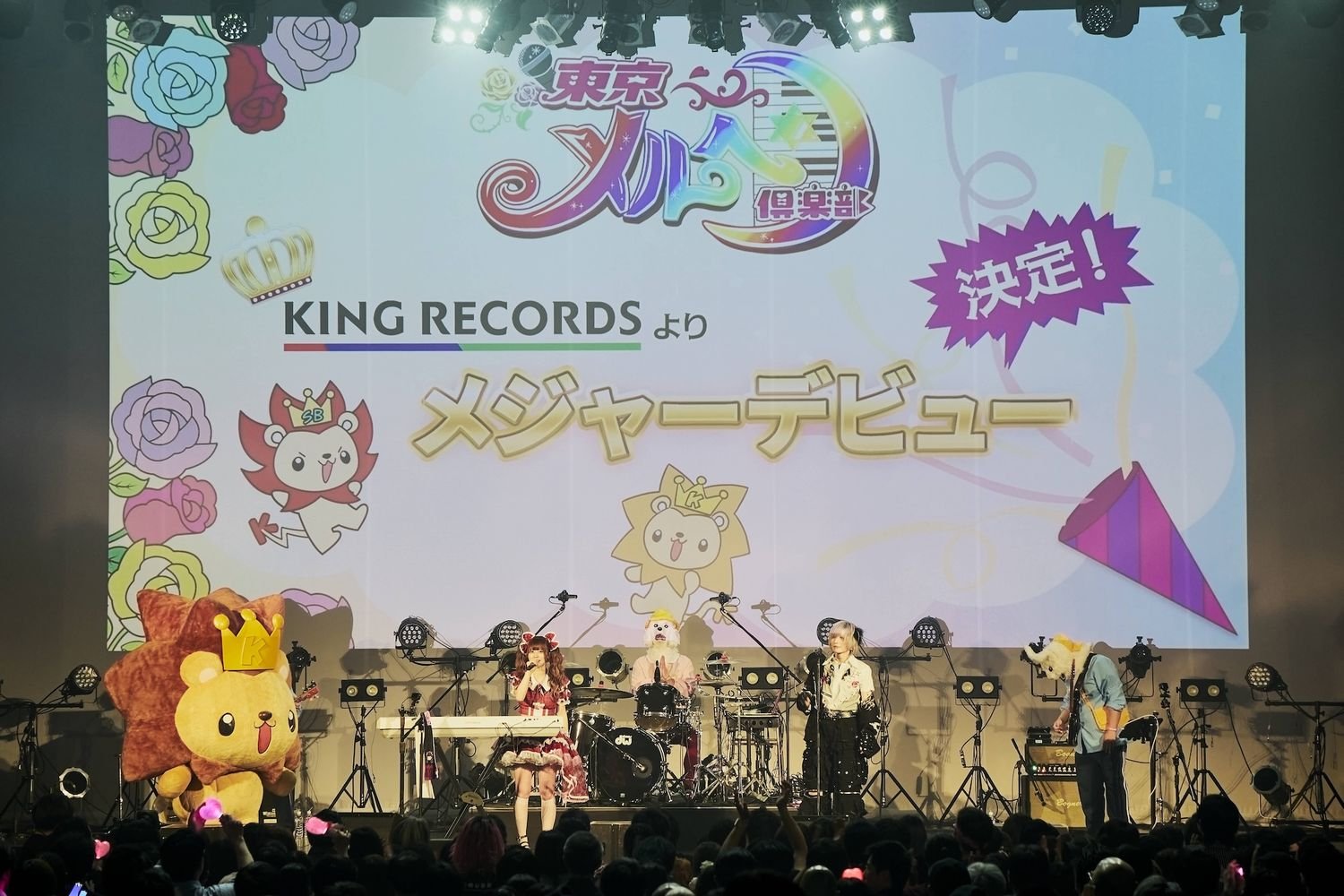 ファンのアンコールの声に導かれ、メンバーがステージ上に再登場。そこでお知らせされたのは「キングレコードからのメジャーデビュー決定」。彼らの祝福にキングレコードのレーベル「KING AMUSEMENT CREATIVE」のマスコットキャラクター“きんくりん”がステージに登場。もふもふの毛皮との交流を楽しみながら、「キングレコードからメジャーデビューすることにはなりましたが、東京メルヘン倶楽部は事務所などには入らず相変わらずセルフプロデュースでやっていこうと思っています。世界厨二病化計画をキングレコードさんと広めていきたいと思います!よろしくお願いいたします!」としずりんがファンに向けて報告。きんくりんが退場した後はメジャーデビュー曲となる「えんぴつ!!!!!」を披露。ヘビーなバンドサウンドとコミカルな歌詞表現の中に“好き”を貫く強さを込めた東京メルヘン倶楽部流の応援ソングを力強く披露すると、ミラが「自分は東京メルヘン倶楽部を始める前にいくつか真面目に取り組んでいたバンドがあって。惜しいところうまく行かなくて思い悩むことが多くて、好きで始めた音楽活動が苦しいと思う自分がいました。そんなときに声をかけてくれたのが、しずりんで。歌とピアノだけで音を合わせて行く中で、これをちゃんと形にして見てもらいたいと思い、昔から信頼しているバンド仲間“どうぶつさん”たちも加わって、自分の中で踏み出せなかった音楽と向き合う気持ちをメンバーが取り戻させてくれました。本当にありがとう! こんなにたくさんの人に東京メルヘン倶楽部を見てもらうことが本当に幸せだと思います。今日はZeppに立たせてもらったけどまだまだ上を目指して突っ走っていきますので応援よろしくお願いします!」と自分自身を振り返りながらファンへ今の想いを口にする。最後に「ありがとう10000のフォロワー」「メルヘン」を2曲披露し、名残惜しまれながらメンバーはステージを後にした。