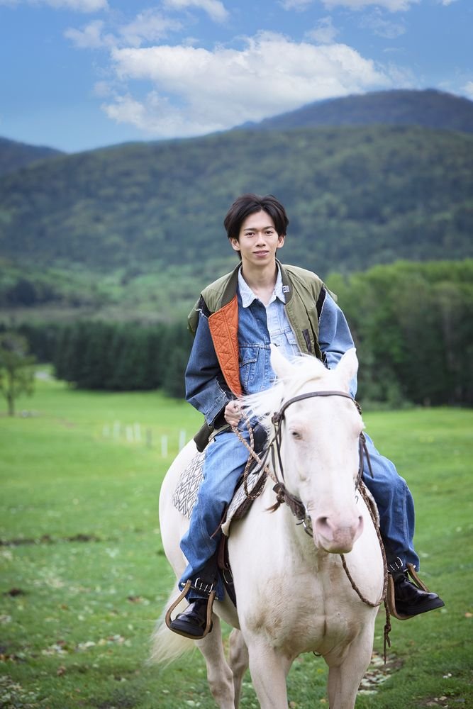また、星野リゾートトマムでは、⼤⾃然の中で乗⾺体験に挑戦。颯爽と⽩⾺に騎乗する姿にときめきと⾃然の⼒強さを感じる、北海道ならではのロケーションを活かしたカットです。