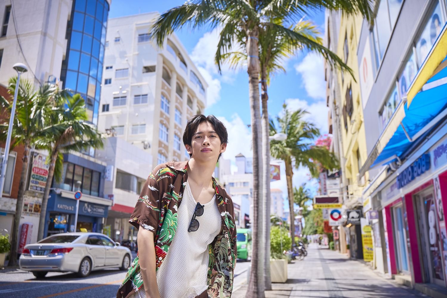 南国・沖縄では、那覇市国際通りでアロハシャツに⾝を包む南国感&オフ感溢れる姿を披露したカットは陽光振り注ぐ沖縄で本作のテーマの「旅」を象徴する旅のワクワクが表現されています。