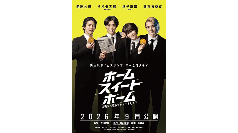 八村倫太郎(WATWING)、増子敦貴(GENIC)、駒木根葵汰、前田公輝が出演する、舞台発!ワンシチュエーションで繰り広げられる、押入れタイムスリップ・ホームコメディ『ホーム スイート ホーム』が、2026年9月全国公開されることが決定いたしました。出演者のコメントおよび、ティザービジュアルの解禁と合わせて、情報初解禁となります。