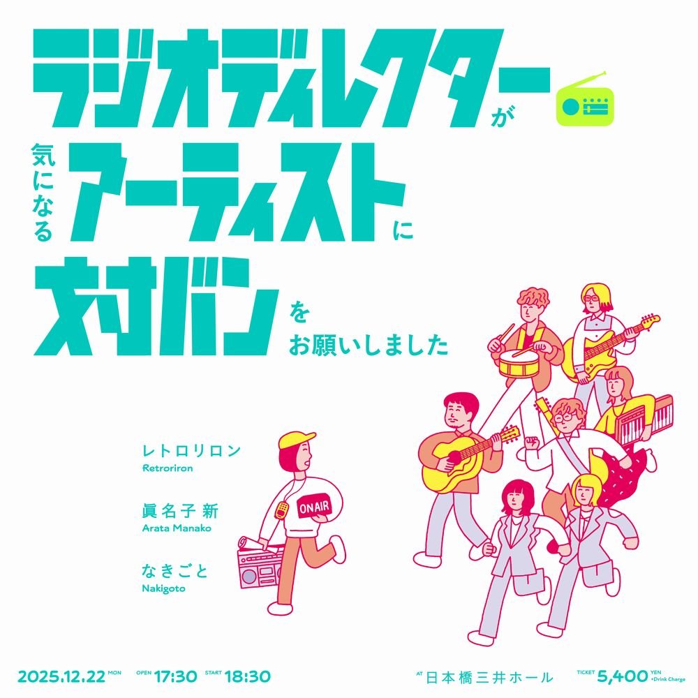 出演はレトロリロン、なきごと、眞名子 新の3組。イベントのタイトルどおり、音楽が大好きで日頃音楽に触れている若手ラジオディレクターが直接アーティストに出演を打診し、実現した対バンイベントで、なきごとのメンバーからもコメントが寄せられている。