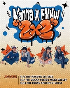 対バン相手は、今年「FUJI ROCK FESTIVALʼ 25 -ROOKIE A GO GO-」「SUMMER SONIC 2025」にも出演したミクスチャーロックバンドEMNW。Kannaにとっては新曲のリリースツアーであり、新世代ミクスチャー対決ともなるこのツアーをお見逃しなく!