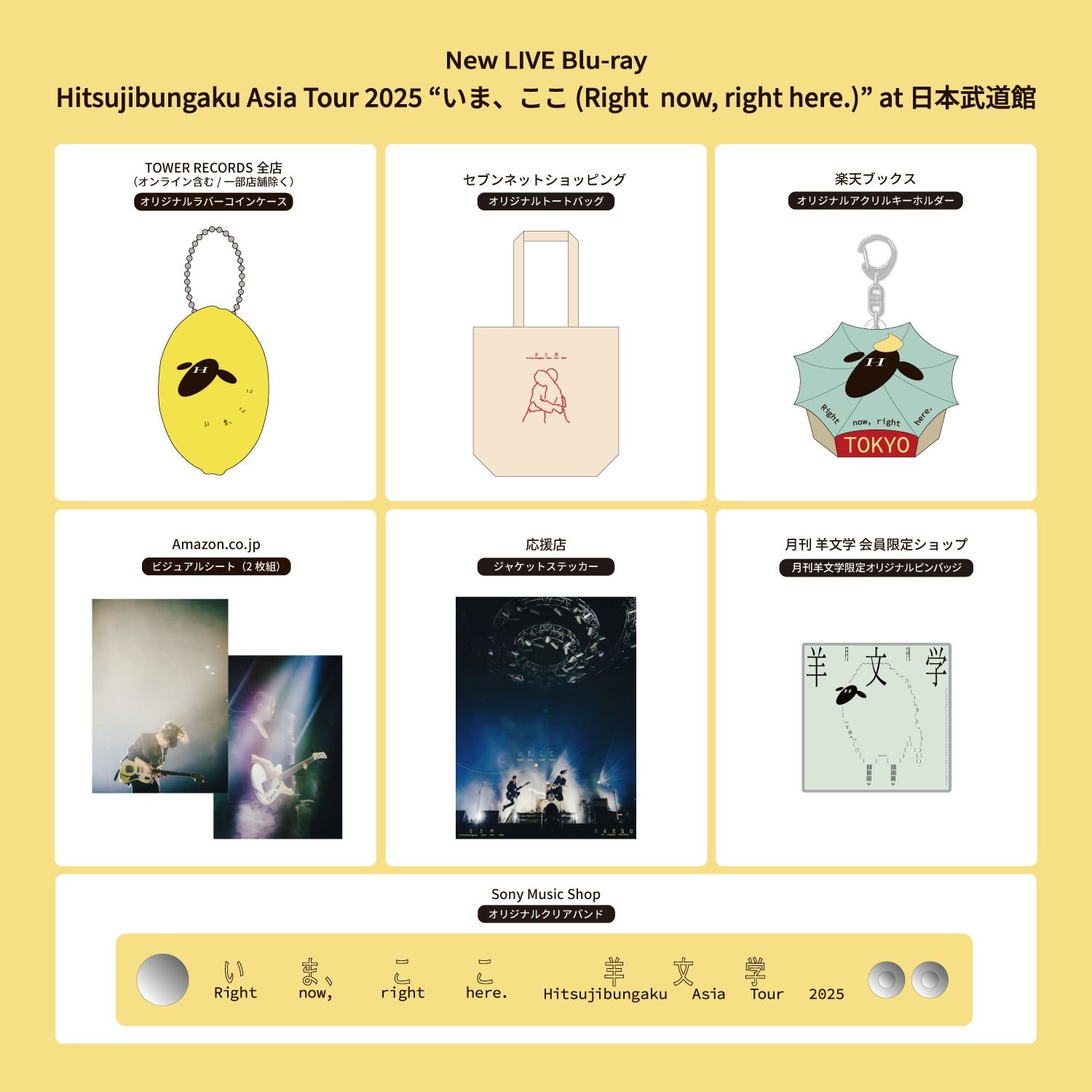 LIVE Blu-rayの店舗別購入者特典の絵柄に加え、初回生産限定盤に付録するオリジナルグッズ「いま、ここ ラゲージタグ」、そしてディスク2(Blu-ray)に収録される初のヨーロッパツアーの旅の記録を収録した「On the Road: Hitsujibungaku Europe Tour 2025」のティザー映像が初公開された。