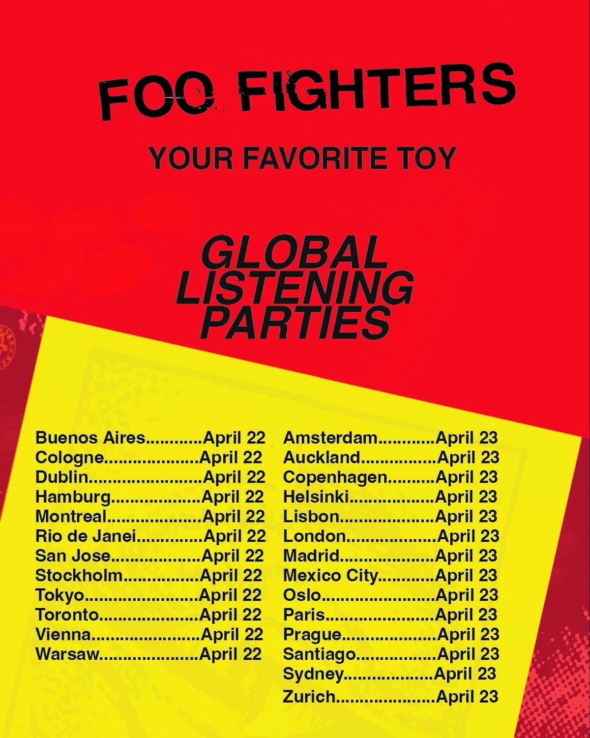 元ニルヴァーナのドラマーであり、現在の音楽シーンを代表するロック・アイコン、デイヴ・グロール率いるフー・ファイターズが、4月24日(金)にリリースするニュー・アルバム『ユア・フェイヴァリット・トイ』の収録曲を一足先に聴けるリスニング・パーティーを全世界主要都市で開催することが決定し、日本でも4月22日(水)夜に東京都内某所にて開催することが決定した。イベントの参加者は応募者の中から抽選にて選ばれ、4月19日(日)午後12時まで応募可能だ。