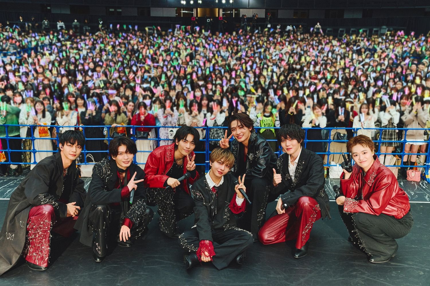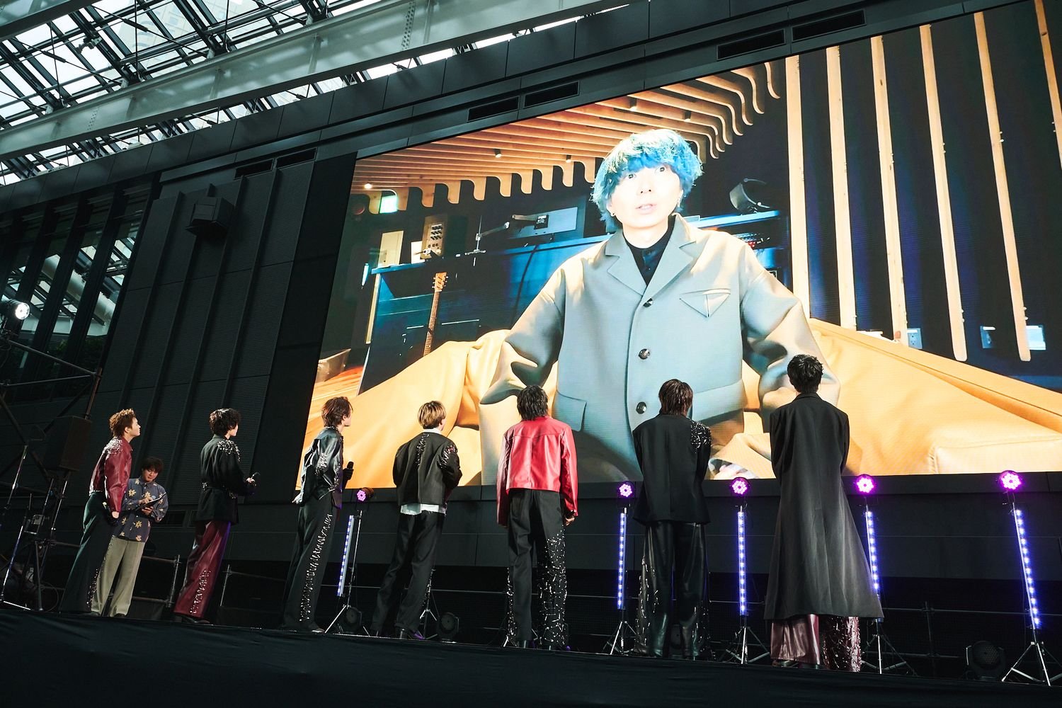 躍動的なSEに乗ってメンバーが特設ステージに登場すると、まずは4月に発売された4thアルバム『核心触発イノベーション』のリード曲で、オフィシャルYouTubeチャンネルでのMV再生数が240万回を突破した「因果応報アンチノミー」をパフォーマンス。「楽しもうぜ!」と気勢をあげた大倉空人はウインクをかまし、黒と赤を基調にレザーやグローブ、安全ピンなどを用いたロック&スタイリッシュなスタイルの7人に、集まった2000人の観測者は熱狂する。