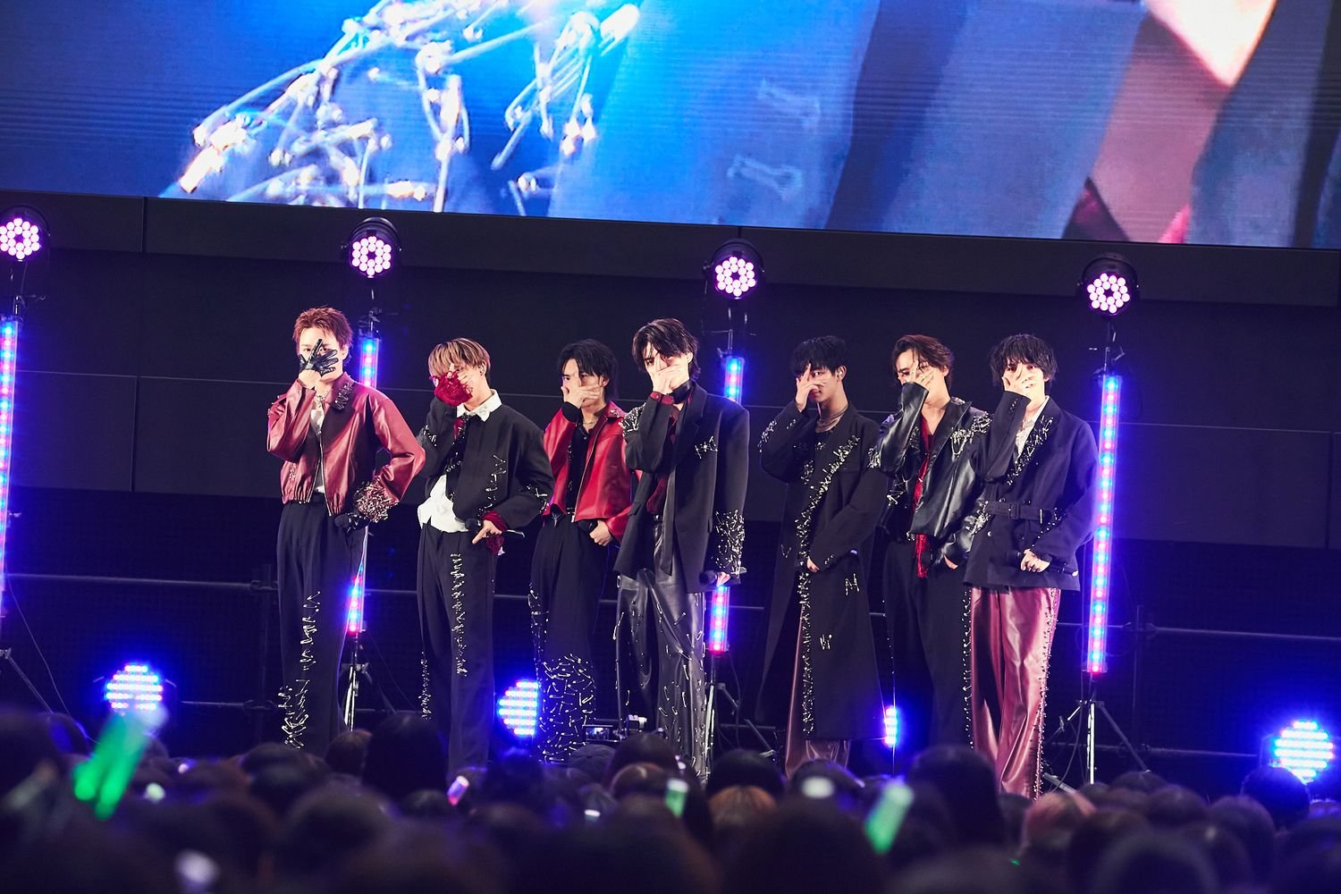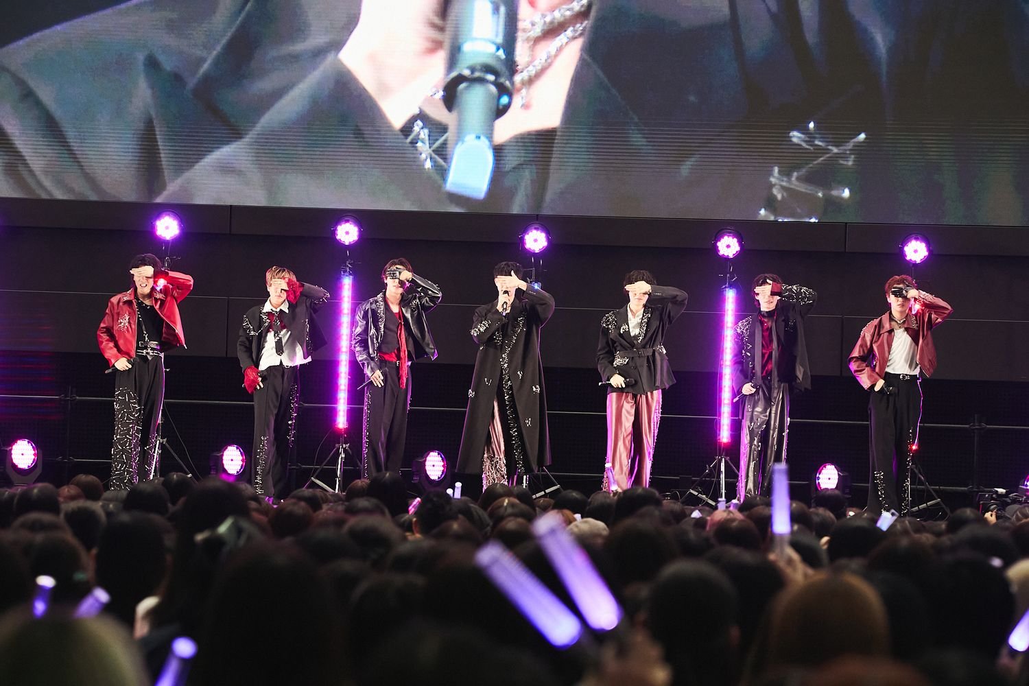 上映後、そのまま7人はステージで「パラノイドランデブー」をパフォーマンス初披露。キャッチーな旋律に乗り、キレの良い動きで目まぐるしくフォーメーションを変えながら、見事なマイクリレーで悩ましい歌声を聞かせていく。まだなじみの薄い新曲にもかかわらず、歌うメンバーが変わるたび一斉に色を変えるペンライトの海も実に壮観だ。