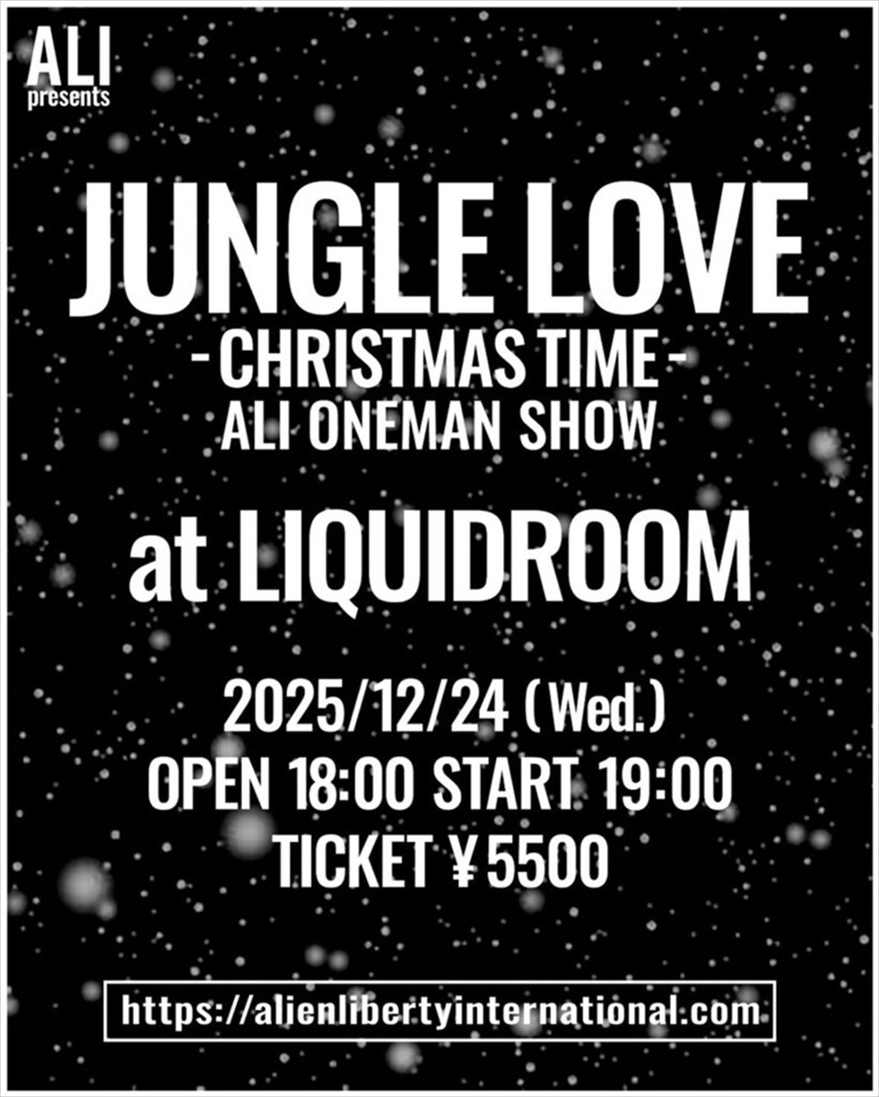 さらに、12月24日には恵比寿LIQUIDROOMにてワンマンライブ「JUNGLE LOVE – CHIRISTMAS TIME – ALI ONE MAN SHOW」を開催。この日だけの特別なセットでのライブを予定している。チケットは一般発売中。