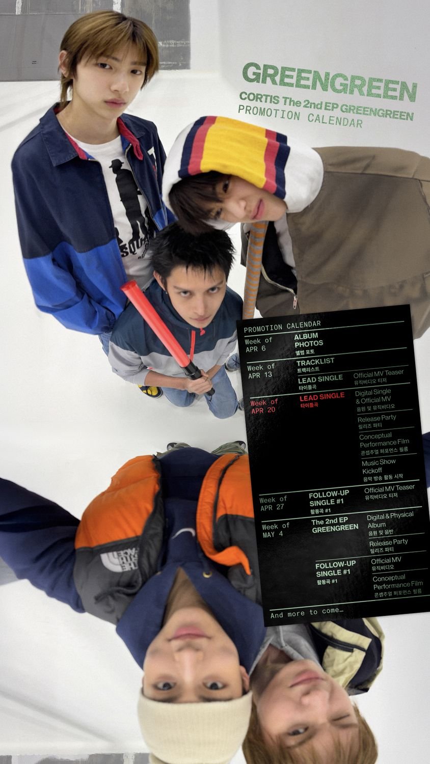3月26日午後9時、CORTIS(MARTIN、JAMES、JUHOON、SEONGHYEON、KEONHO)の公式SNSを通じて公開されたThe 2nd EP[GREENGREEN]のプロモーションカレンダーによると、彼らは4月20日にタイトル曲の音源を公開し、本格的な活動に乗り出す。タイトル曲のOfficial MVに加え、ダンスにフォーカスしたConceptual Performance Filmも立て続けに公開される予定だ。