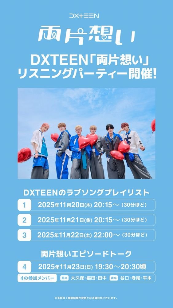 そんな中、「両片想いエピソード」の募集がDXTEEN Official TikTokにでスタート。11月23日(日)19:30-20:30には、Stationhead にて、「両片想い」を聴きながら、そのエピソードをメンバーが紹介する。