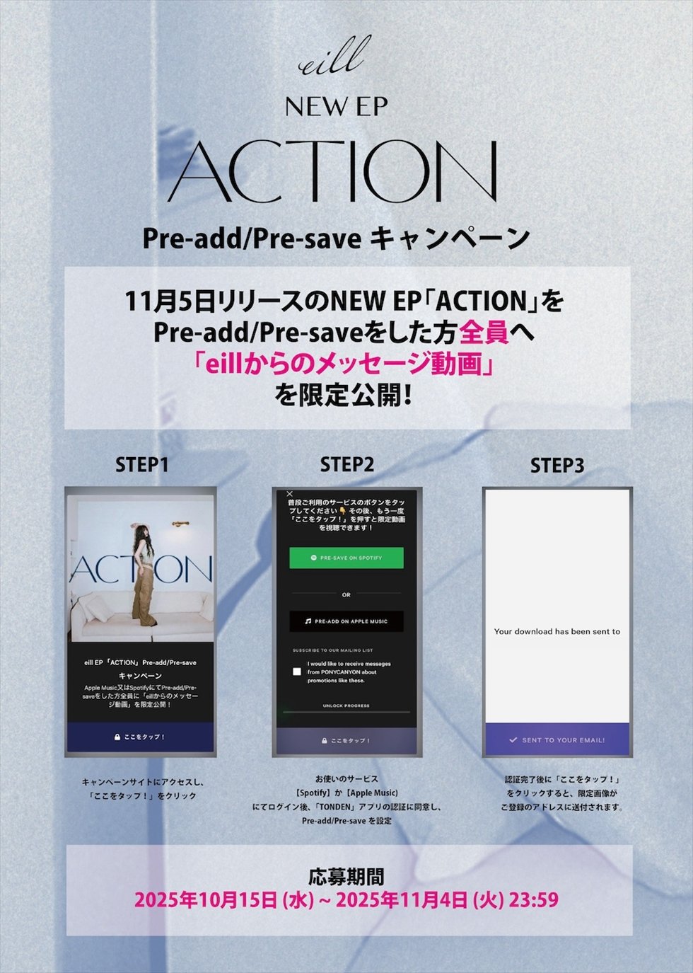 2025年11月5日 (水) 配信開始のNew EP「ACTION」のリリースを記念して、Apple Music/Spotifyを対象に、Pre-add/Pre-saveキャンペーンを開催いたします。実施期間中にPre-add/Pre-saveをした方全員へ「eillからのメッセージ動画」を限定公開!