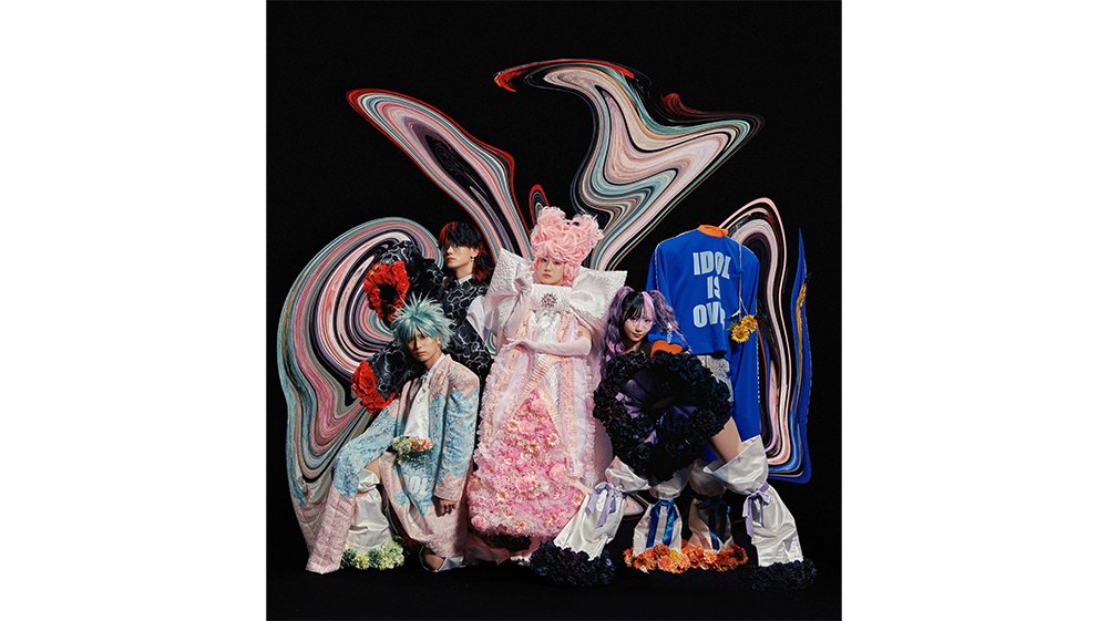 その周囲には、シアンのスパイクヘアにクラシカルなテキスタイルを組み合わせた人物、黒基調の衣装に真紅の花束を抱えた人物、紫のツインテールと大量のフリルによって構築された人物が配置される。