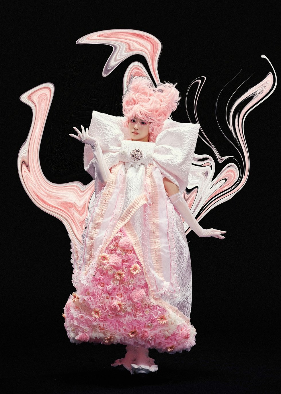 画面中央には、フリルとレースを幾重にも重ねた淡いピンクの衣装に、彫刻作品を思わせる巨大ショルダーを纏った人物が立つ。