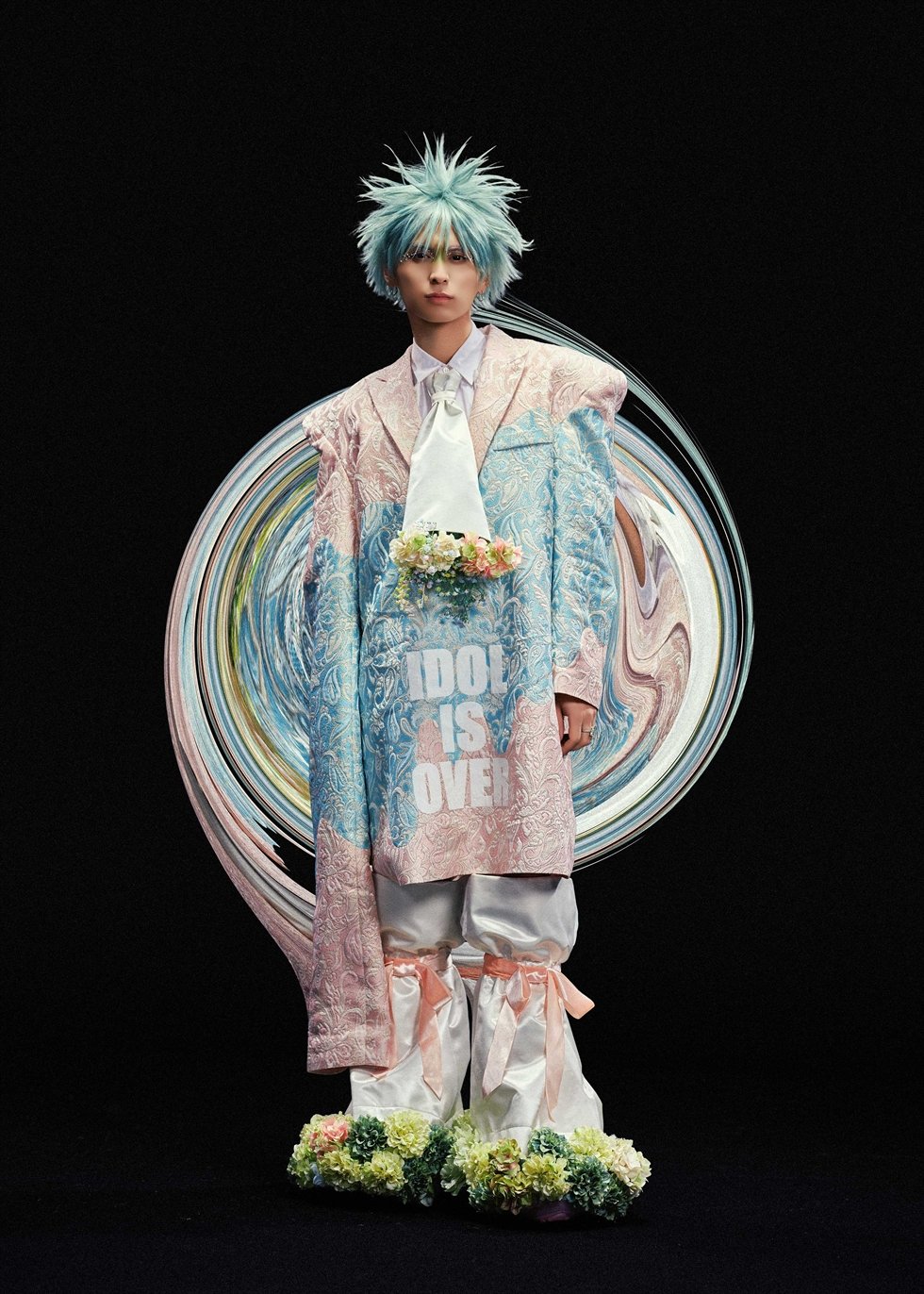 さらに「IDOL IS OVER」と大きく配された青い衣装(ボディ)が静かに存在し、“アイドル”という概念そのものを舞台装置として提示しているかのようだ。