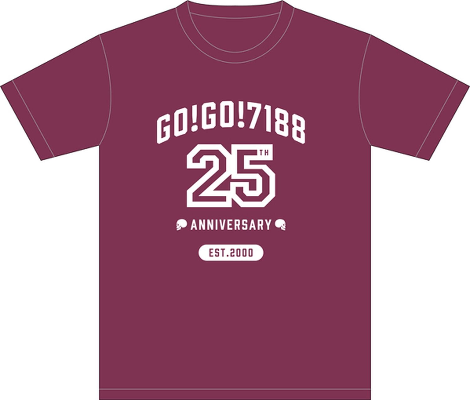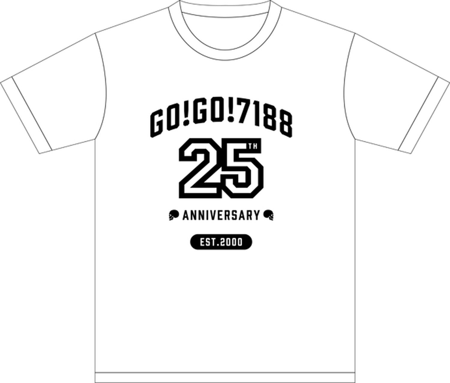 そして、25周年記念オリジナルTシャツは、「何か新しいモノを作りたい」という当時のスタッフとデザイナーの想いから誕生。ver.1『Mythic Beasts』は、GO!GO!7188のアートワークに多く用いられてきた“和テイスト”を現代的にアレンジ。大胆なバックプリントと、メンバー3人それぞれの楽器をモチーフにしたフロントマークが印象的な、大人仕様のデザインとなっている。ver.2『Skull College』のデザインを中心に手がけたのは、GO!GO!7188のライブに赤ん坊の頃から来ていた、そのデザイナーのお嬢さん。成長した彼女が父と共に制作した、親子2代によるアートワークが実現した。こちらは新しくGO!GO!7188を知る世代への“入門編”として、フレッシュな感覚を取り入れている。