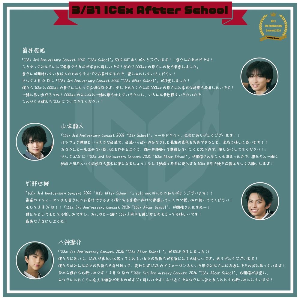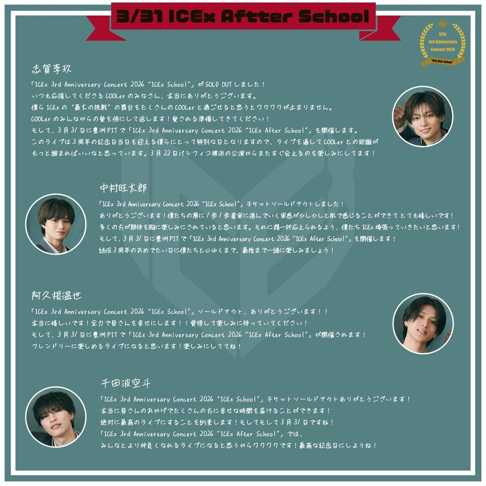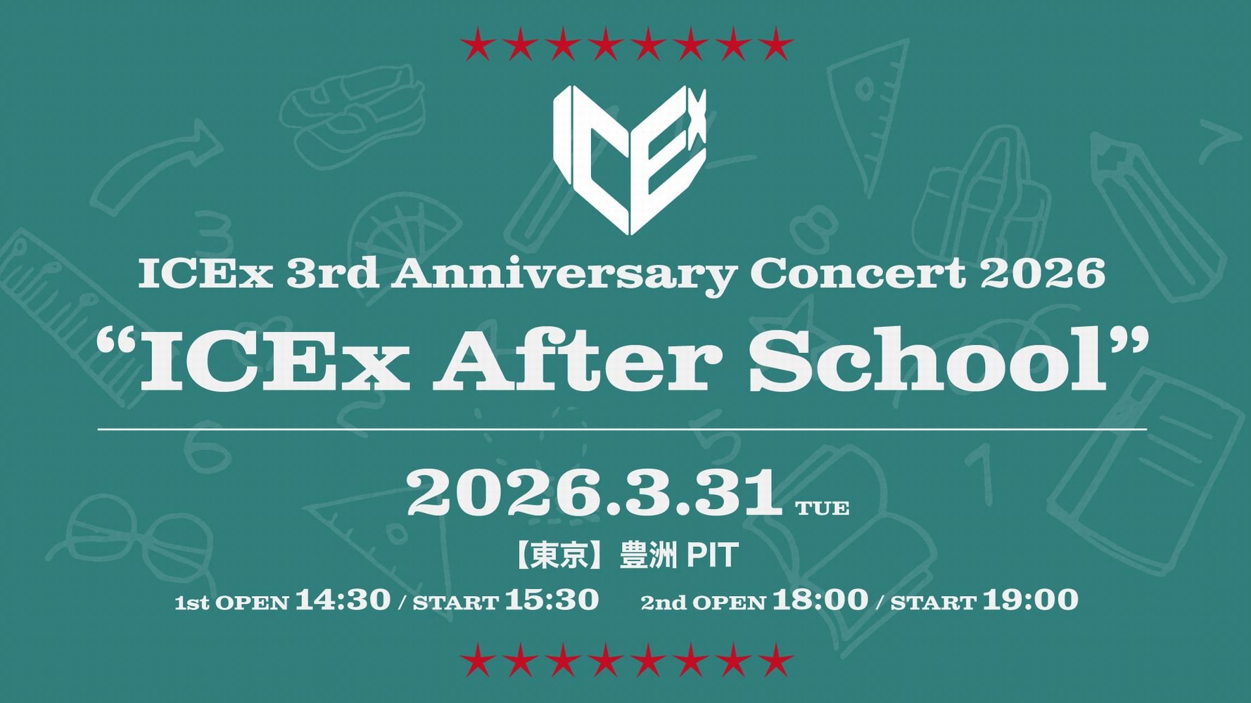 そんなICExが、3月22日にパシフィコ横浜 国立大ホール行われる『ICEx 3rd Anniversary Concert "ICEx School"』のチケット完売を受け、本日新たに、”結成3周年となる記念すべき3月31日”に『ICEx 3rd Anniversary Concert 2026 "ICEx After School"』を豊洲PITにて開催することを発表した。