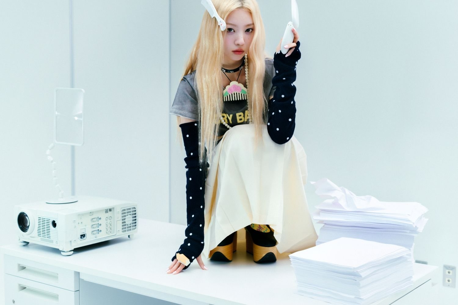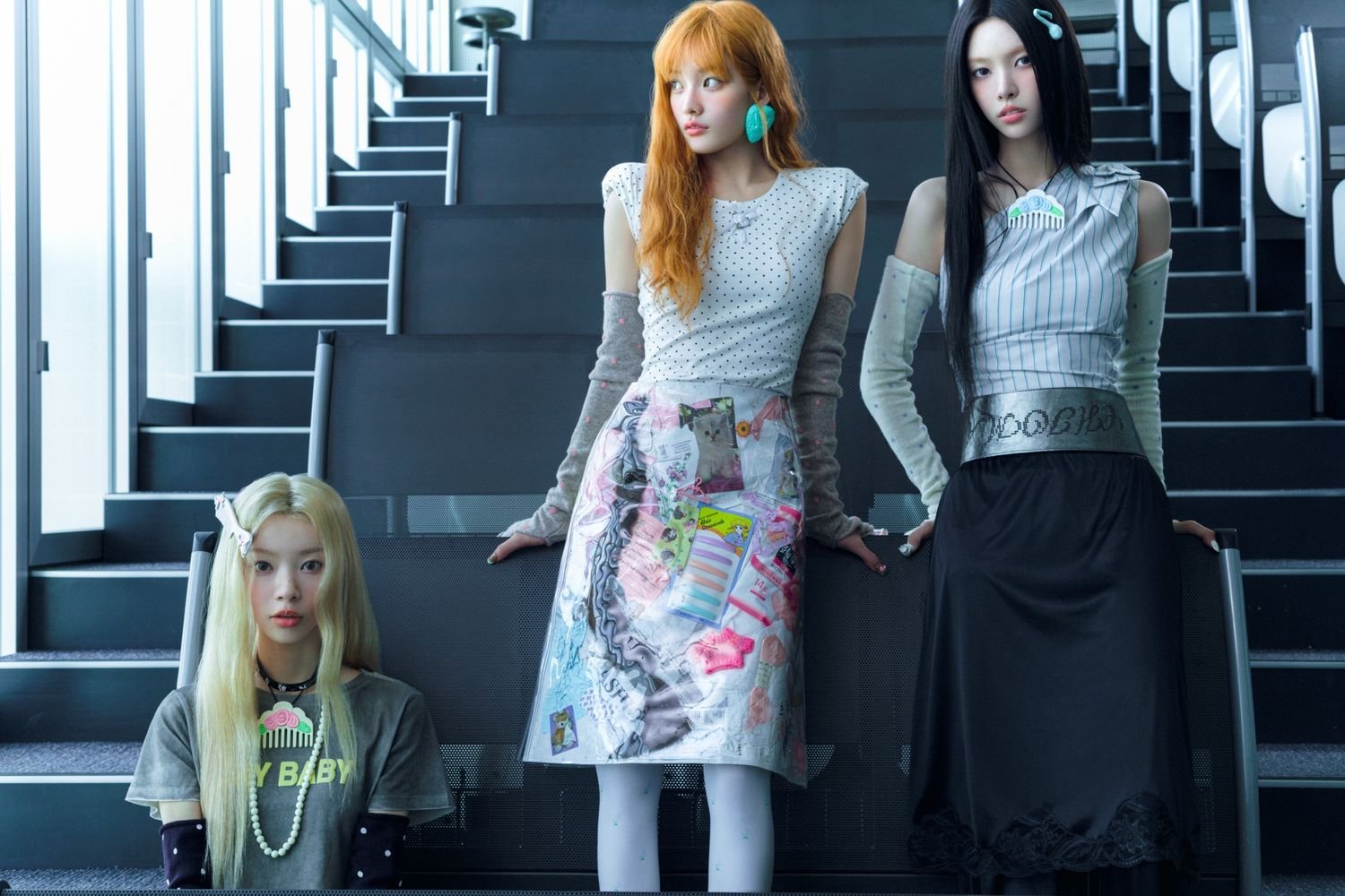 「NOT CUTE」バージョンは“もうかわいいだけではない”と叫んだILLITの新しい姿を盛り込んだ。無彩色の古い事務室と対比するILLITのユニークでキッチュなビジュアルが視線を引く。大胆なヘアカラー、個性あふれるスタイリングは、従来のILLITのイメージから脱し、多彩な魅力を見せてくれる。笑顔を抑えたシックな表情の中でも自然ににじみ出る可愛さが印象的だ。