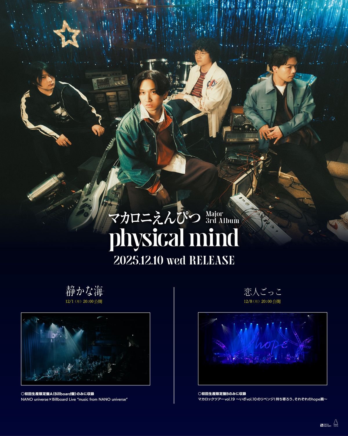 マカロニえんぴつが、12月10日(水)に発売するMajor 3rd Full Album「physical mind」に収録される初のBillboard公演「マカロニえんぴつ at Billboard Live OSAKA and TOKYO 2025」より、「静かな海」のライブ映像を公開した。