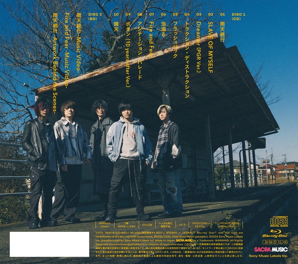 今作アルバムは、特典映像を収録したBlu-ray同梱、三方背ケース仕様の初回生産限定盤と通常盤の2形態でのリリースとなります!初回生産限定盤に同梱のBlu-rayには、「雨天続行」のMusic Videoに加え、最新シングル「Fire and Fear」のMusic Video、さらには「雨天続行」のMusic Videoとジャケット撮影時のメイキングを編集した「雨天続行 -Artwork Behind the Scenes-」も収録されますので、是非チェックしてください!