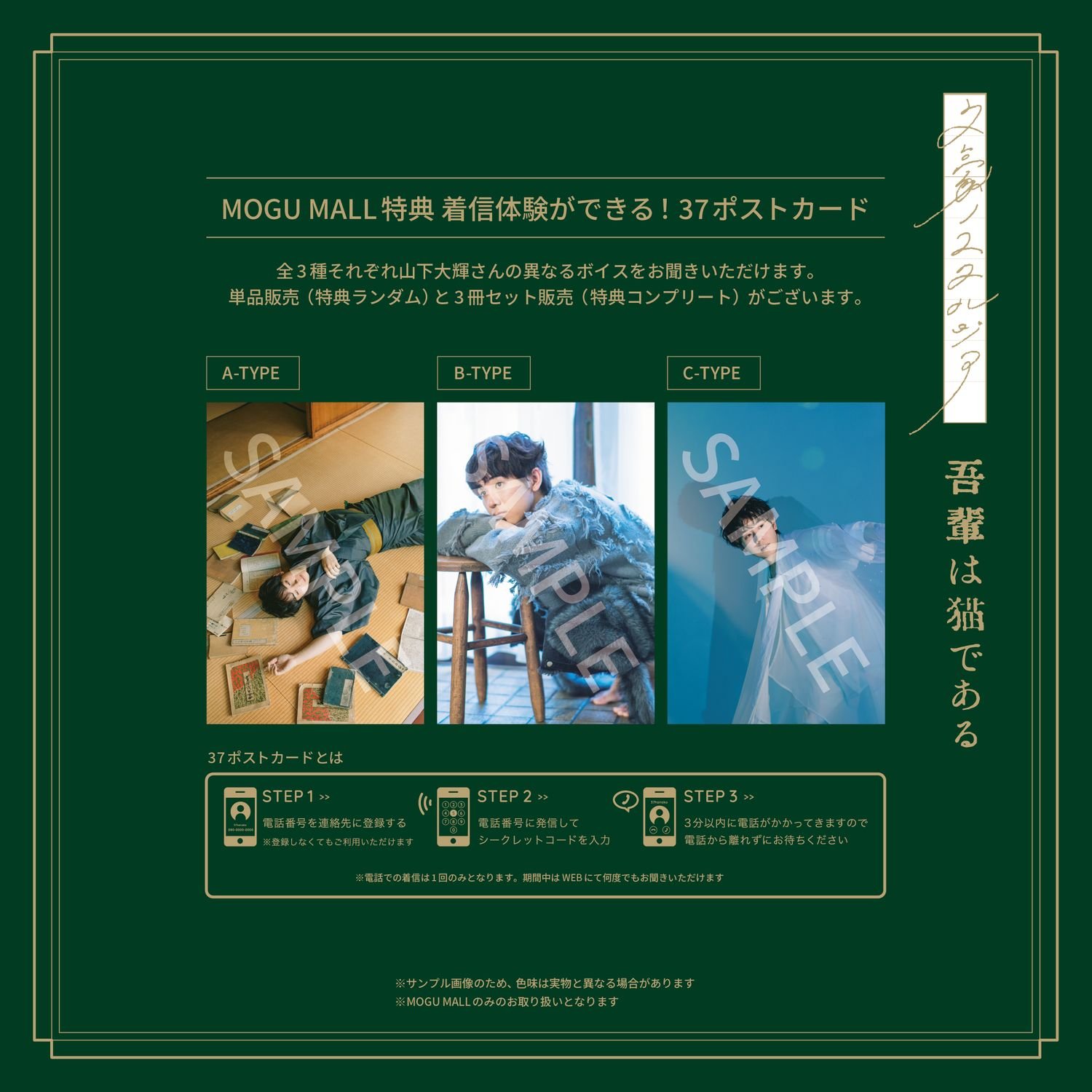 MOGURA ENTERTAINMENTの通販サイト・MOGU MALLでは、“着信体験ができる” 37card(サンナナカード)のシステムを搭載した山下さんのボイス付き「37ポストカード」を特典としてご用意。絵柄およびボイスはA-TYPE、B-TYPE、C-TYPEの3種類でのランダム封入となり、写真集3冊と「37ポストカード」全種を同梱したコンプリートセットも販売いたします。