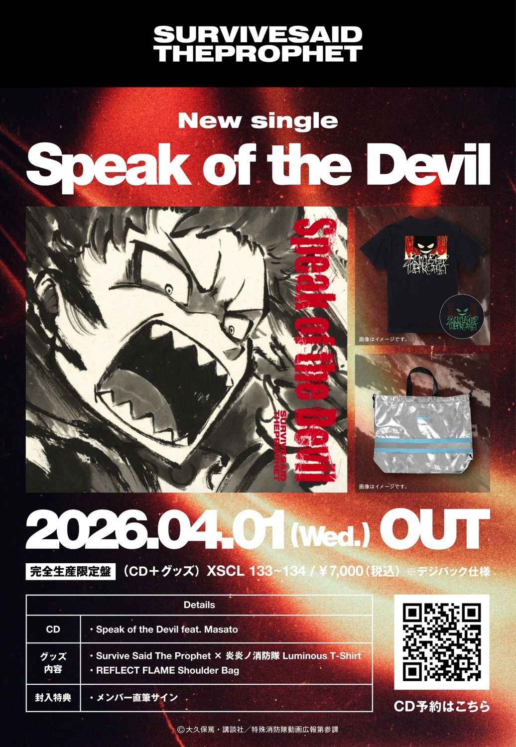 TVアニメ『炎炎ノ消防隊 参ノ章』第2クールエンディングテーマとして話題沸騰中のSurvive Said The Prophet(通称:サバプロ)のニュー・シングル『Speak of the Devil』が4/1(水)にCDリリース決定。また、毎週金曜25時53分から放送のTVアニメ『炎炎ノ消防隊 参ノ章』第2クールエンディングテーマを含む、豪華収録内容、アートワークも解禁された。