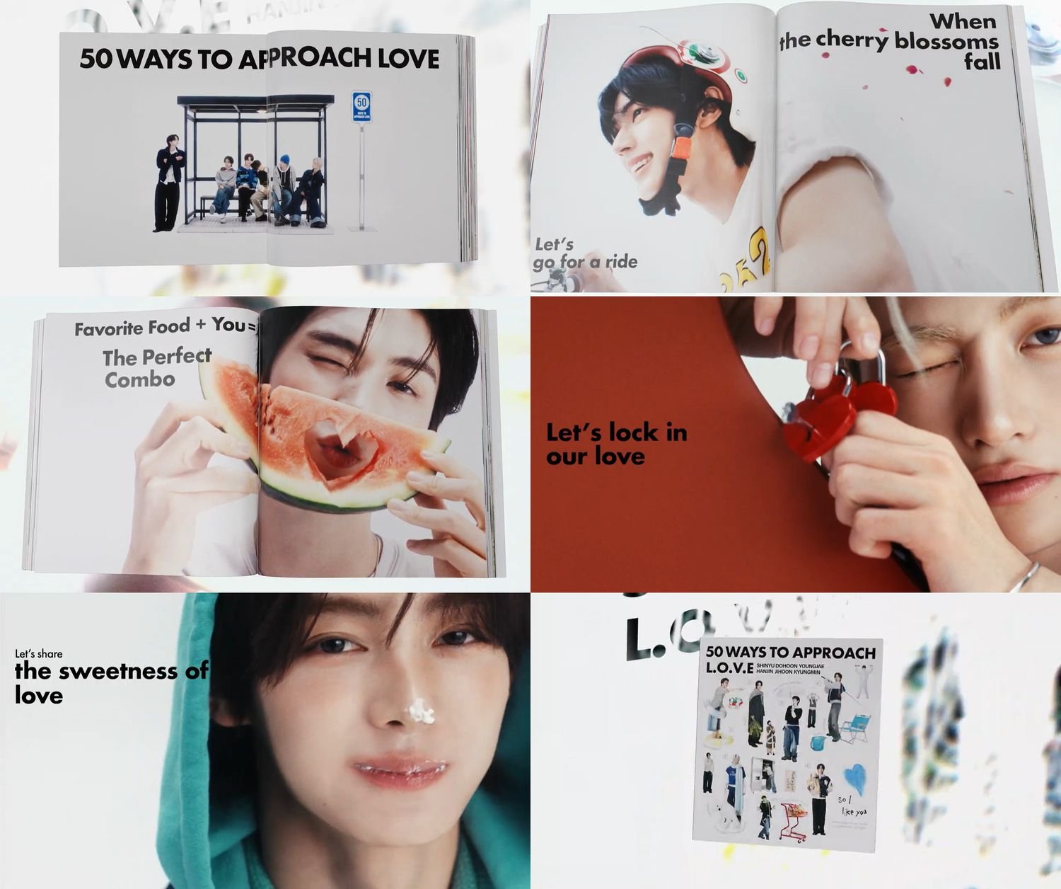 コンセプトフィルムは、愛を得るための50の方法に挑戦するTWSを生き生きと描き出した。鏡を見て表情の練習をしたり、デートのコースを考えたり、どんな服を着るか悩んだりするなど、ときめきに直面した少年たちの純粋な感情がそのまま伝わってくる。特に、まだ愛に不慣れな6人のメンバーの初々しい行動が楽しい笑いを誘い、TWS特有の爽やかで清涼感あふれる魅力を倍増させている。