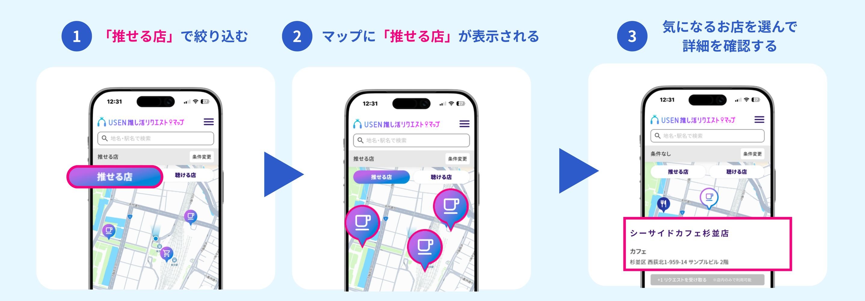 『推しリク』のマップより「推せる店」対象店舗を検索、店内からアクセスすると登録アカウントからさらに「1リクエスト/24回分(※3) 」が可能です。「推せる店」の新たなリクエスト方法は、『推しリク』マップサイト(スマートフォン専用)でご確認ください。