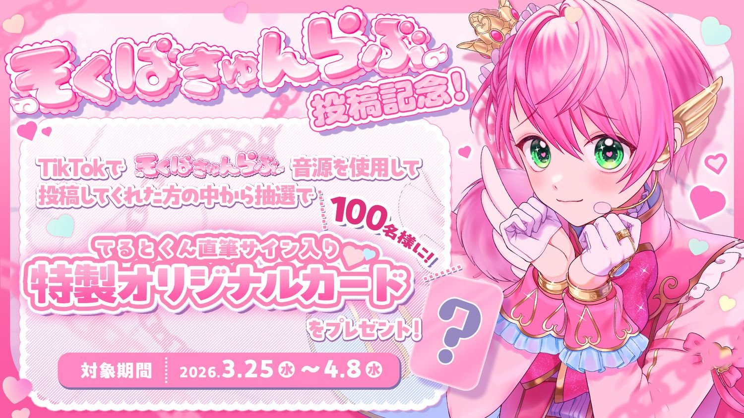 また、『そくばきゅんらぶ』投稿記念キャンペーンを実施します。TikTokで『そくばきゅんらぶ』音源を使用して投稿してくれた方の中から抽選で100名様に「てるとくん直筆サイン入り特製オリジナルカード」をプレゼント!「束縛(手錠)」をイメージした、中毒性たっぷりのキュートなサビ振付をぜひ踊って「てるとくん」に届けましょう!