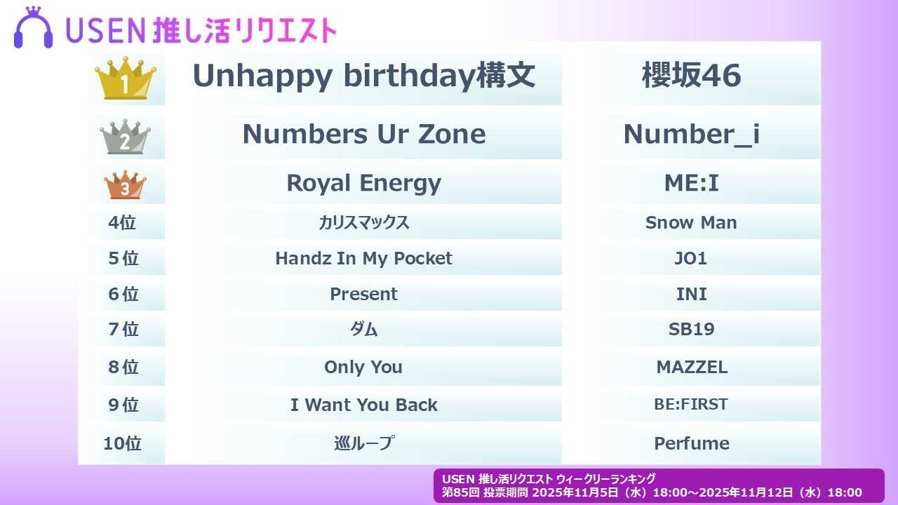 第85回の推しリク ウィークリーランキングは櫻坂46 13th Singleの表題曲『Unhappy birthday構文』が4週連続となる1位を獲得した。