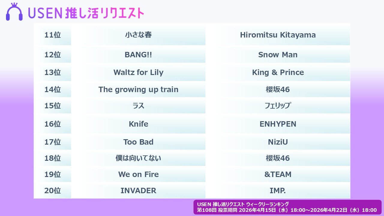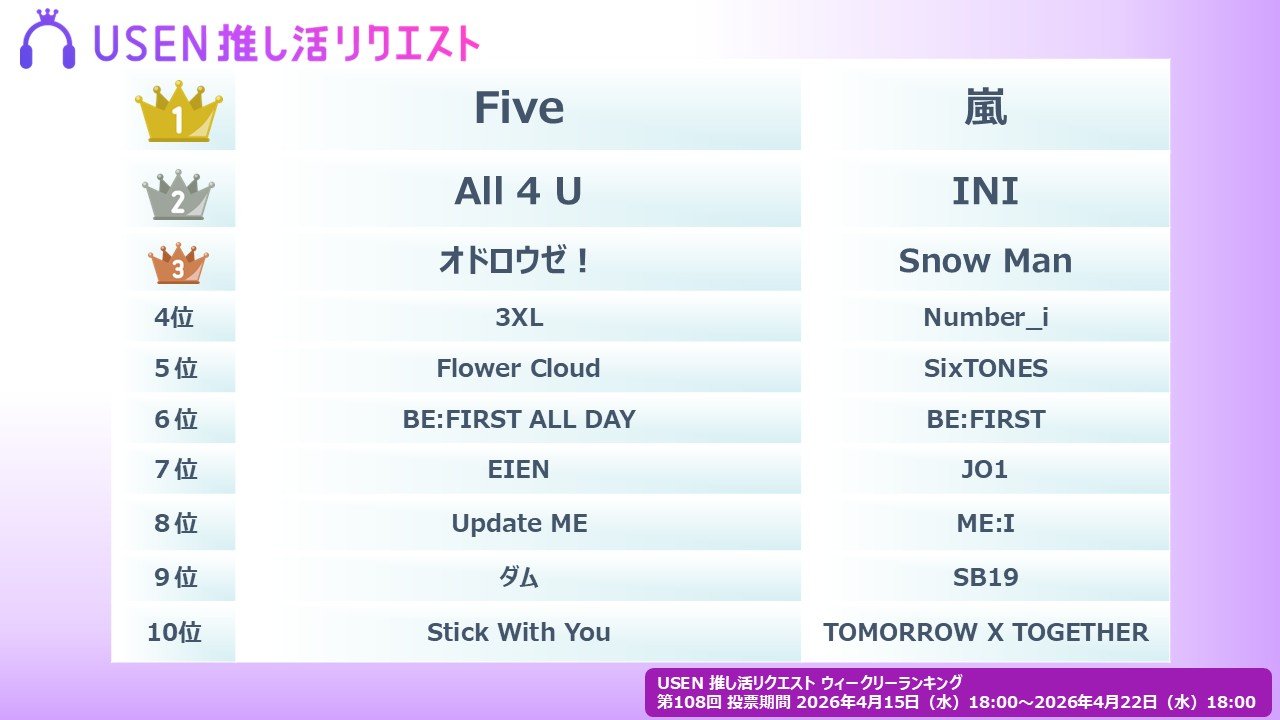 株式会社 U-NEXT HOLDINGSのグループ会社である株式会社 USENが運営する USEN 音楽配信サービスにおいて、だれでも参加できる楽曲投票サービス『USEN 推し活リクエスト』(以下、推しリク)における楽曲リクエスト(投票)をもとに 2026年 4月15日(水)より集計した『USEN 推し活リクエストランキング』の第108回「ウィークリーランキング」を発表。2026年4月25日(土)よりウィークリーランキング番組の配信が開始となる。