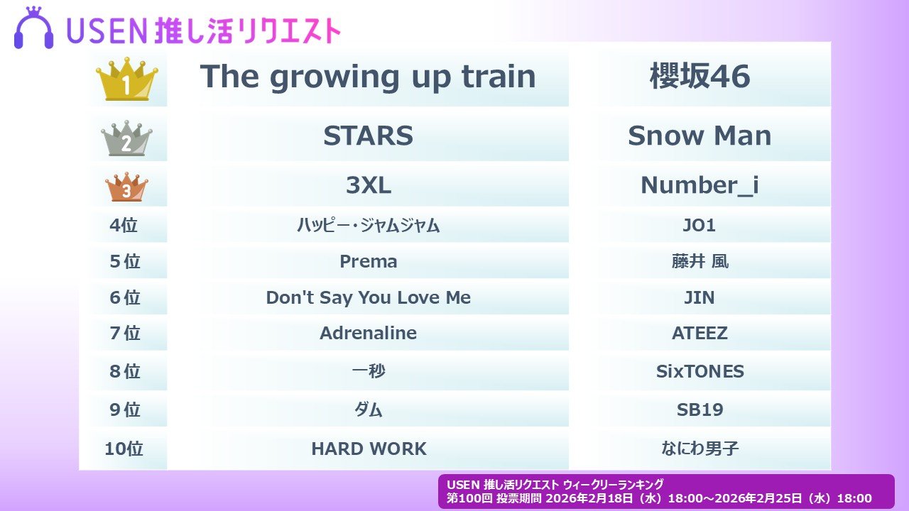 第100回の推しリク ウィークリーランキングは、3月11日にリリース予定で、2月12日0時に先行配信となった櫻坂46 14thシングルの表題曲『The growing up train』が1位を獲得した。