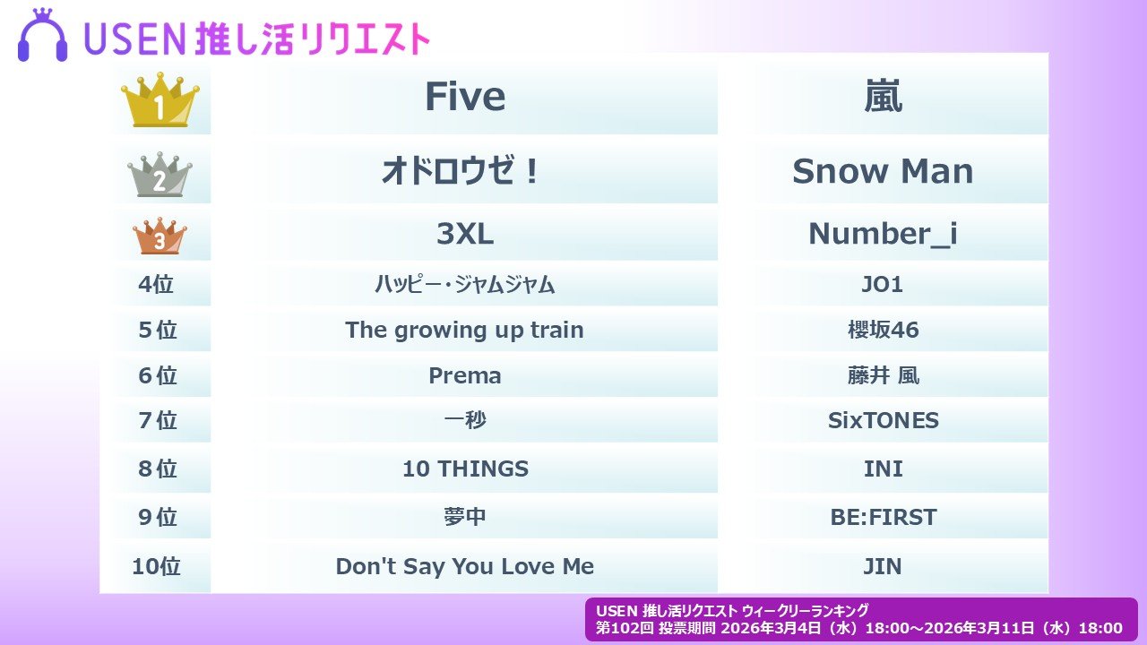 第102回の推しリク ウィークリーランキングは、3月4日(水)に配信リリースとなった嵐の新曲「Five」が1位を獲得した。
