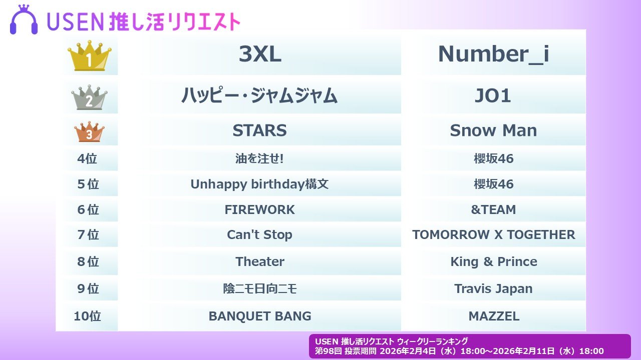 株式会社 U-NEXT HOLDINGSのグループ会社である株式会社 USENが運営する USEN 音楽配信サービスにおいて、だれでも参加できる楽曲投票サービス『USEN 推し活リクエスト』(以下、推しリク)における楽曲リクエスト(投票)をもとに 2026年 2月4日(水)より集計した『USEN 推し活リクエストランキング』の第98回「ウィークリーランキング」を発表。2026年2月14日(土)よりウィークリーランキング番組の配信が開始となる。