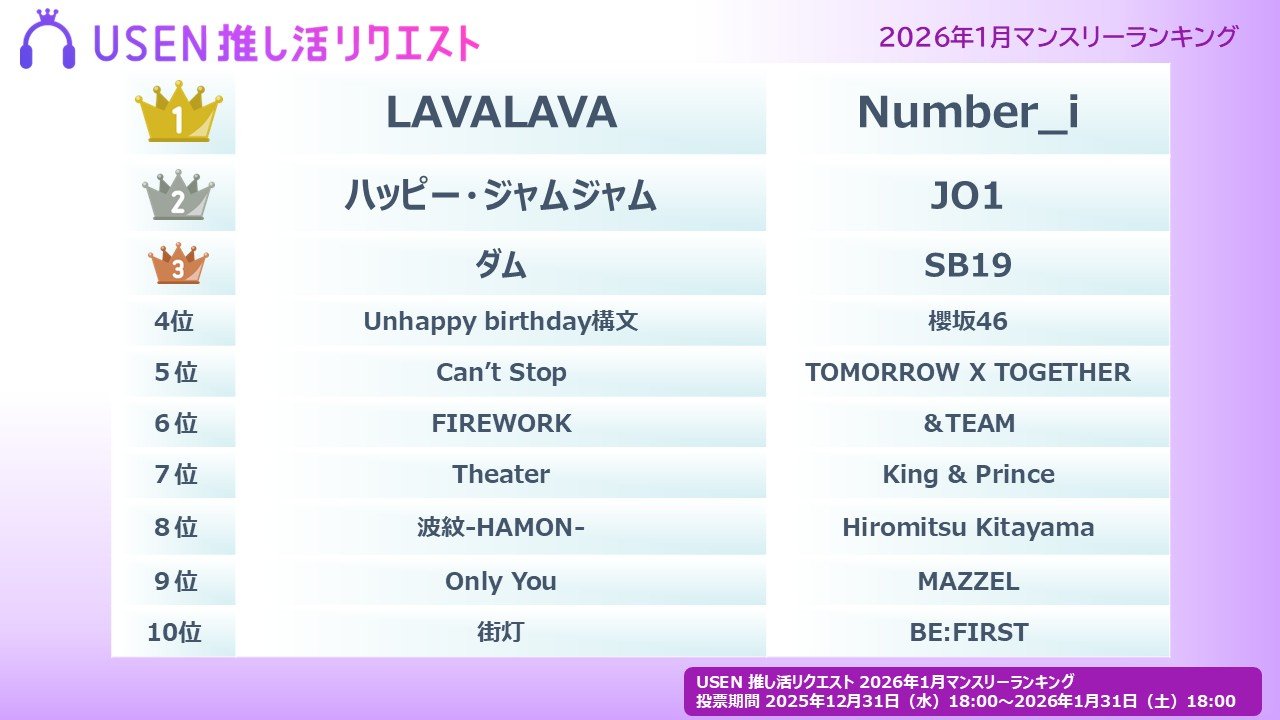 そんな「推しリク」の「2026年1月マンスリーランキング」は、Number_i「LAVALAVA」が1位に輝いた。