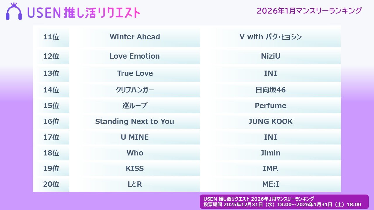 USEN&U-NEXT GROUPの株式会社USENは、USEN音楽配信サービスの新サービスとして2024年3月27日より開始した、だれでも参加できる楽曲投票サービス『USEN 推し活リクエスト』(以下、推しリク)の「2026年1月マンスリーランキング」を発表した。