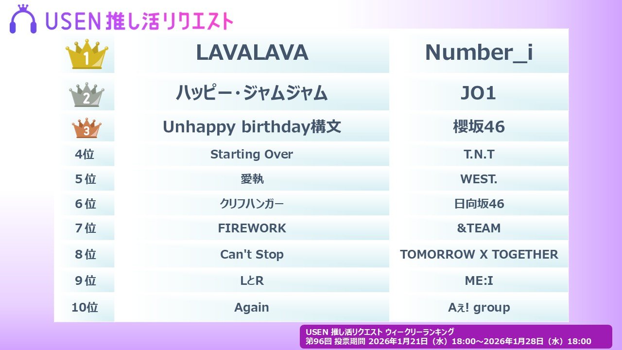 Number_iの新曲「LAVALAVA」が返り咲き!6度目の1位を獲得!USEN 推し活リクエスト(推しリク)第95回 「ウィークリーランキング」を発表!~ 上位ランクイン楽曲は1月24日(土)より街中・店内で配信